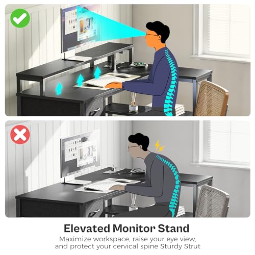 SUPERJARE 47 inch Reversible L Shaped Desk with LED Lights & Power Outlets, Computer Desk with Shelves & Monitor Stand, Gaming Desk with Drawer, Home Office Desk Corner Desk, Black