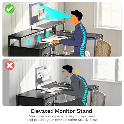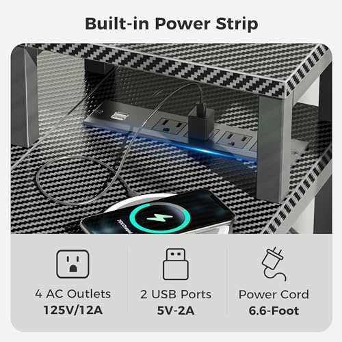 SUPERJARE 47 inch Reversible L Shaped Desk with LED Lights & Power Outlets, Computer Desk with Shelves & Monitor Stand, Gaming Desk with Drawer, Home Office Desk Corner Desk, Carbon Fiber Black