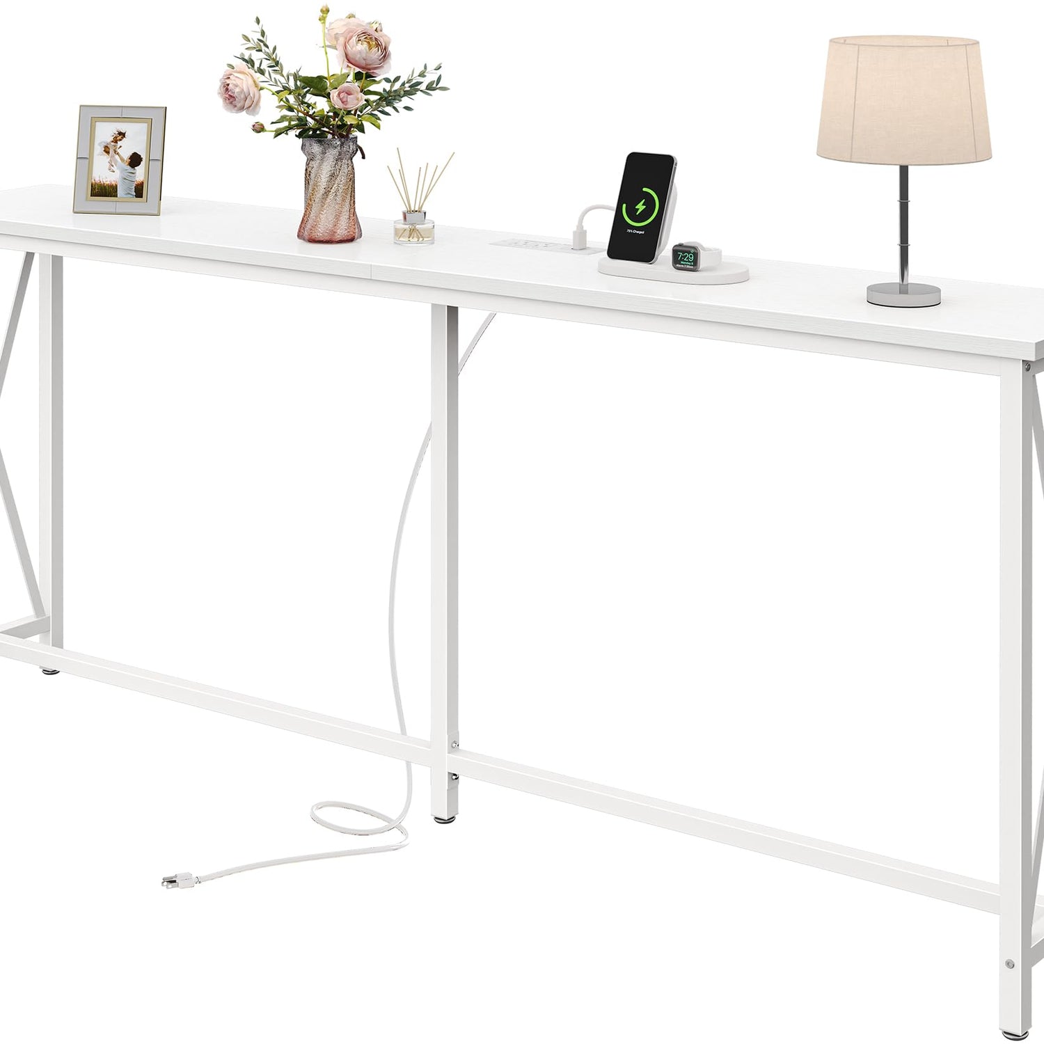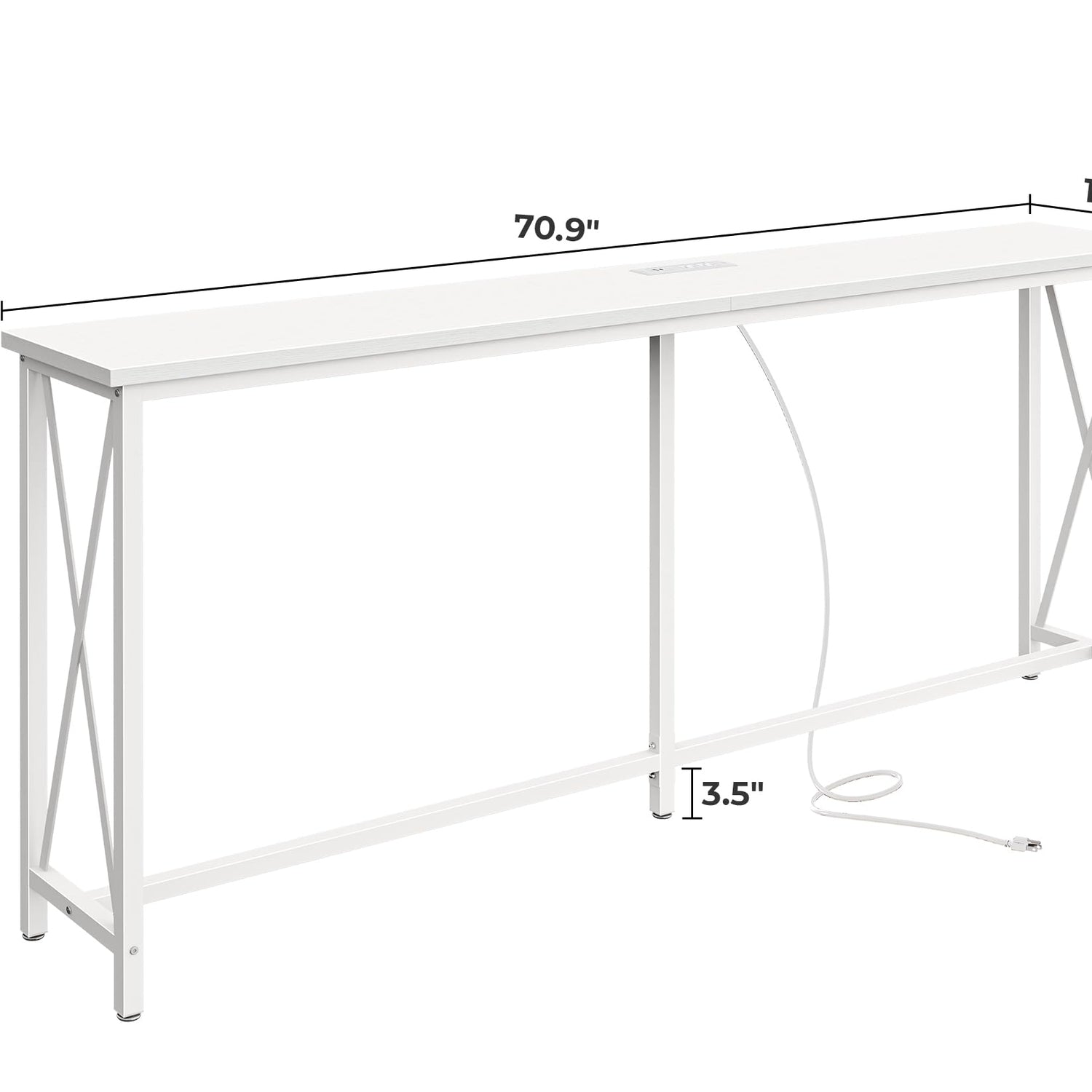 SUPERJARE 70 Inch Console Table with 2 Outlets, 1 Type-C and 1 USB Port, Extra Long Entryway Table with Metal Frame and X-Shaped Bars, Narrow Sofa Table for Living Room, Hallway, White