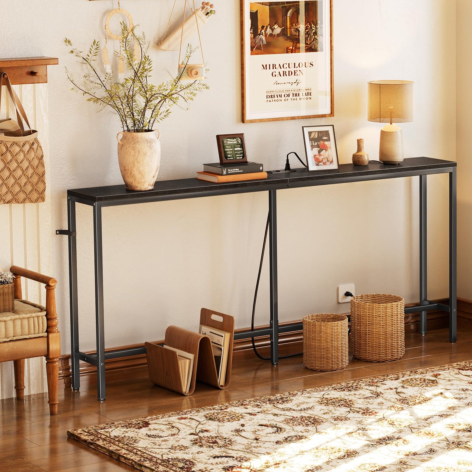 SUPERJARE 70 Inch Console Table with Outlet, Sofa Table with Charging Station, Narrow Entryway Table, Skinny Hallway Table, Behind Couch Table, for Living Room, Black