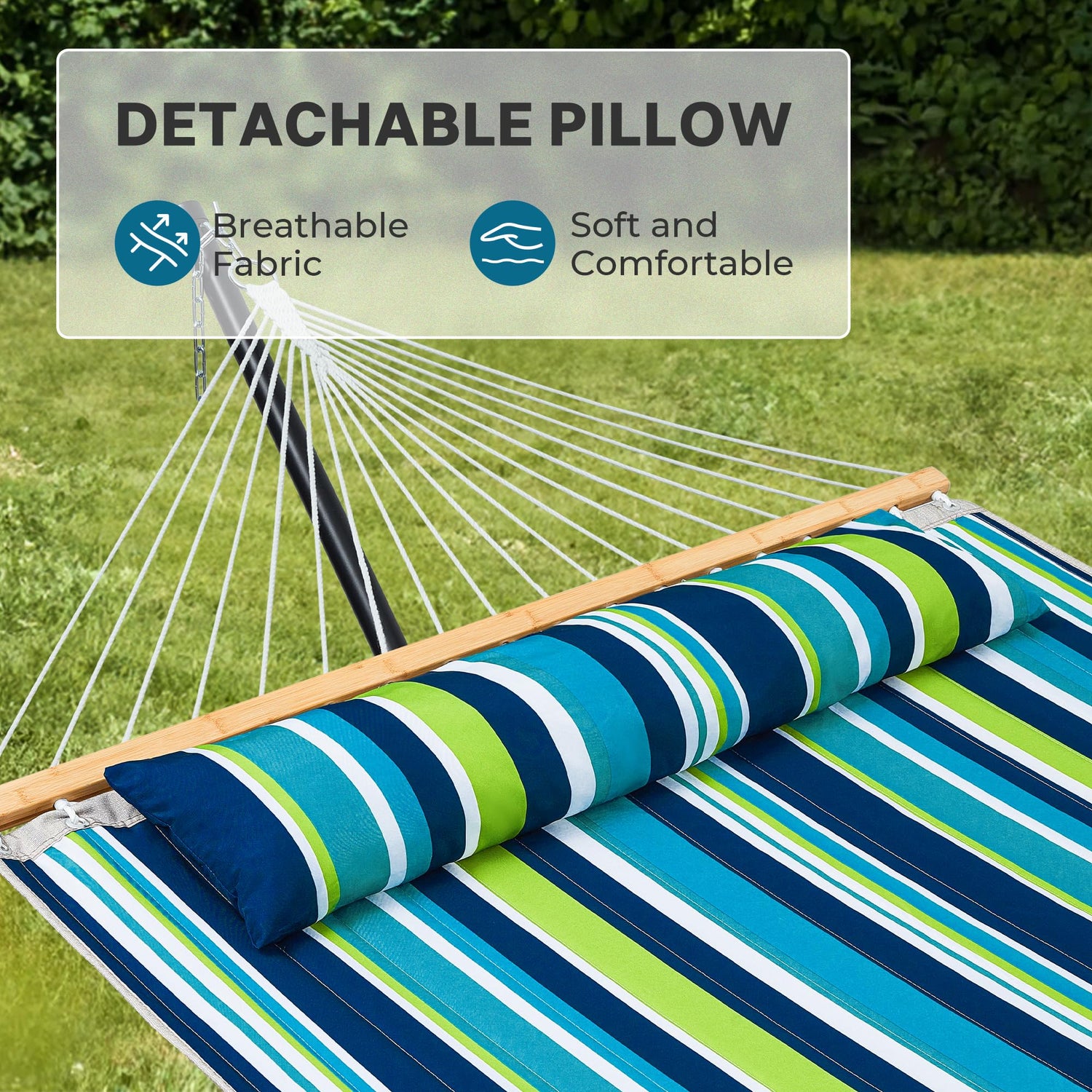 - Outdoor Comfort: Sink into relaxation with our 12FT polyester fabric quilted hammock, coming with a detachable soft pillow for soft head support. Designed to hold 2 people, this outdoor hammock with stand offers a wide surface, perfect for lazy summer afternoons. And with adjustable chains, you're in control of your comfort heights