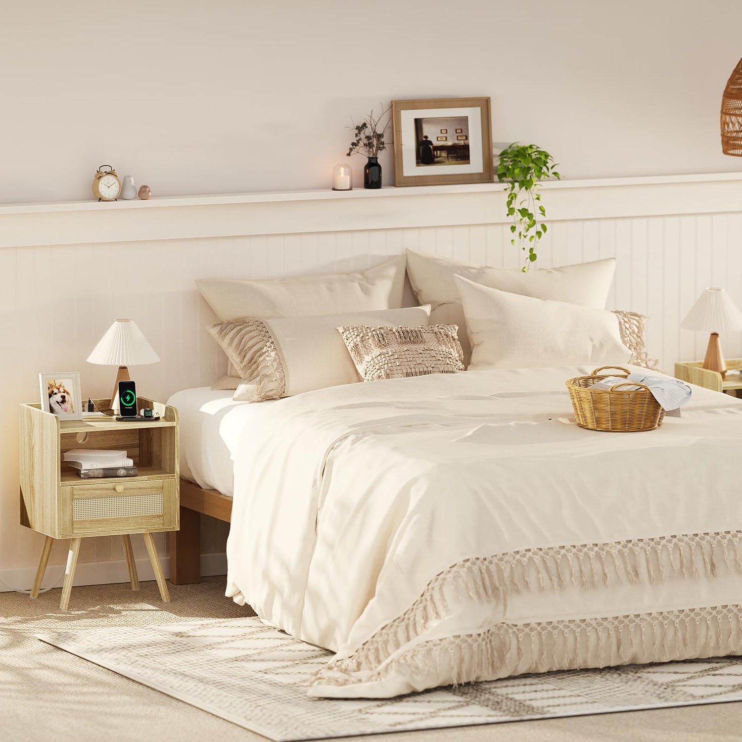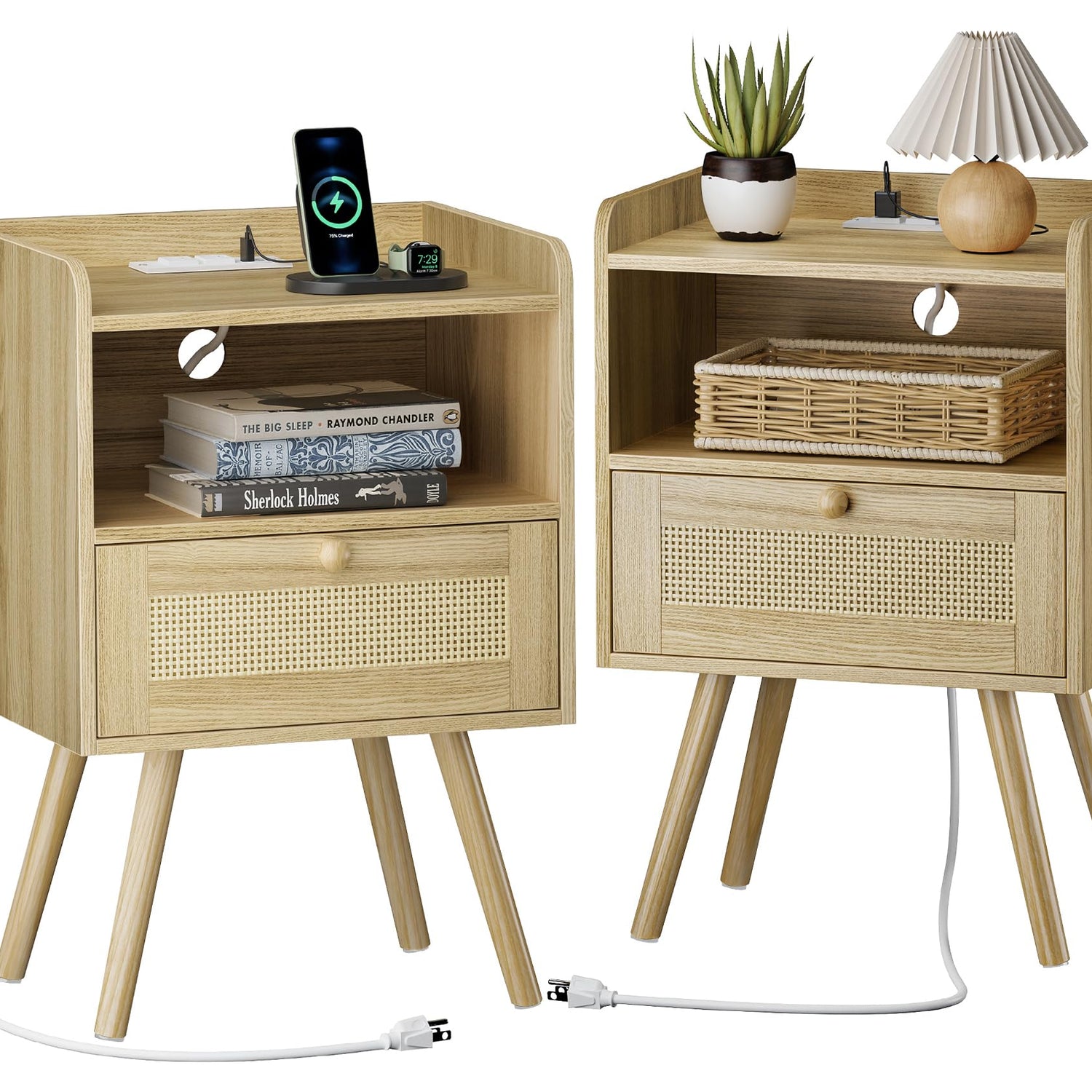 SUPERJARE Nightstands Set of 2, Night stands with Charging Station & PE Rattan Decor Drawer, Bed Side Tables with Solid Wood Feet, End Table, for Bedroom, Living Room - Natural
