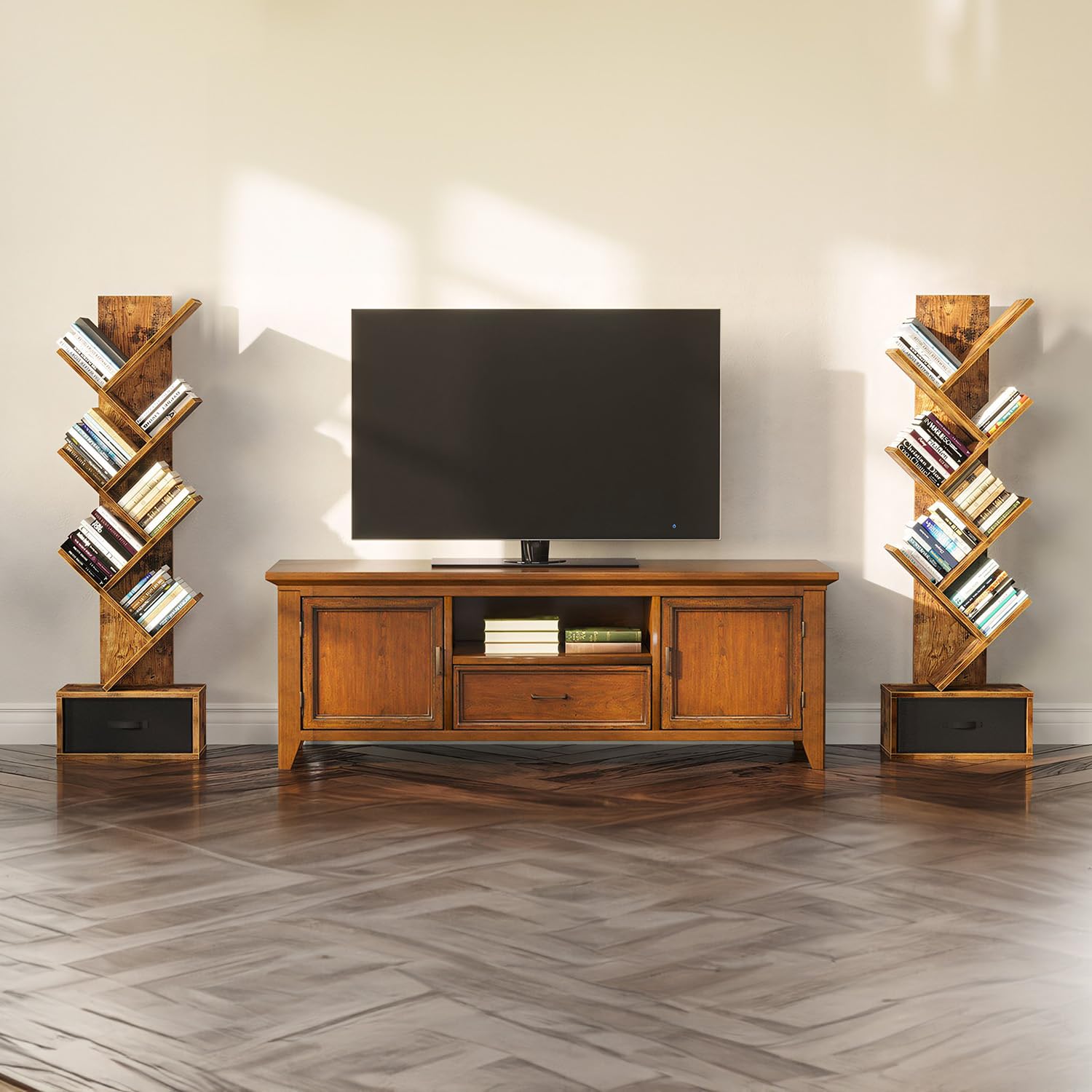 SUPERLELE 6 Shelf Bookshelf with Drawer, Retro Tree Bookcase Floor Standing Bookcase for CDs/Movies/Books, Utility Book Organizer Shelves for Bedroom, Living Room, Home Office