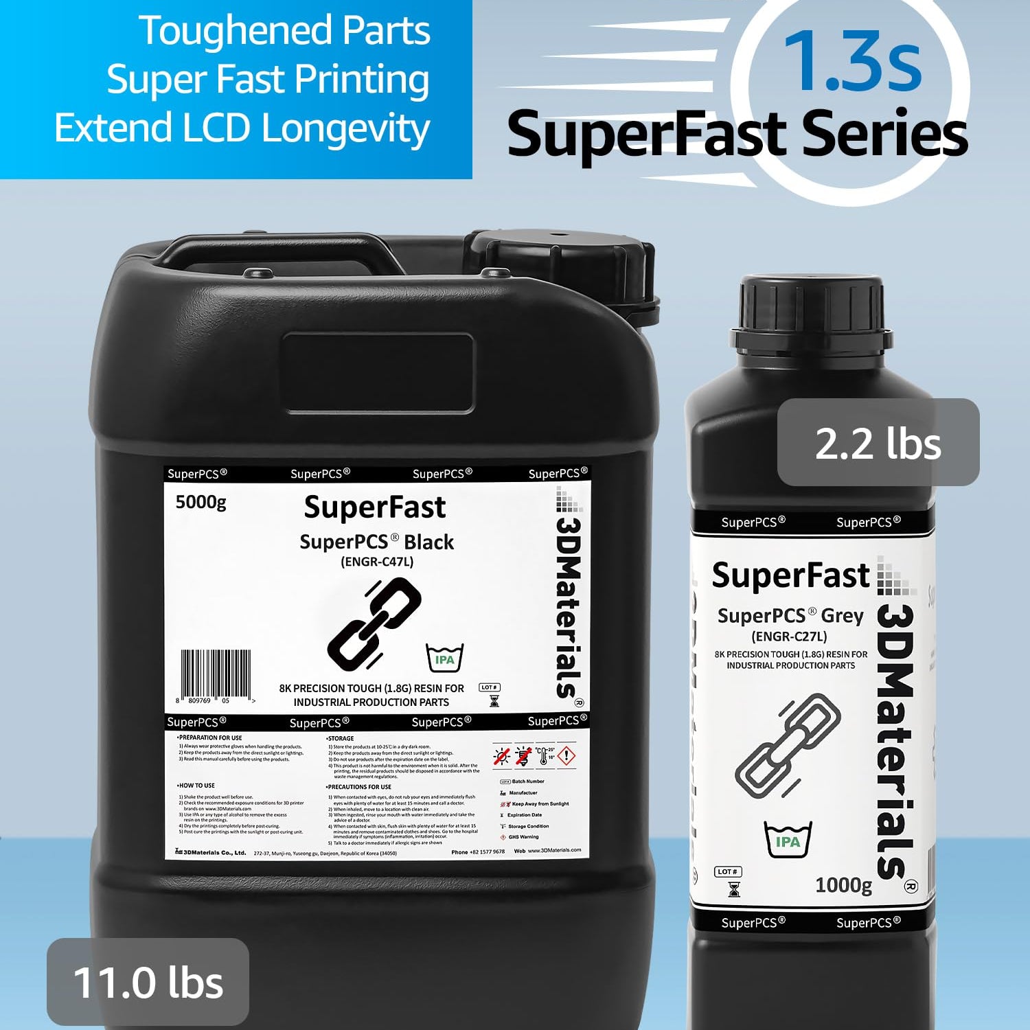 SuperPCS 3D Printer Resin, Toughest and Fastest, 50um 1.8GPa Print in 1.5 sec, Made in Korea by 3DMaterials (1000g, Grey)