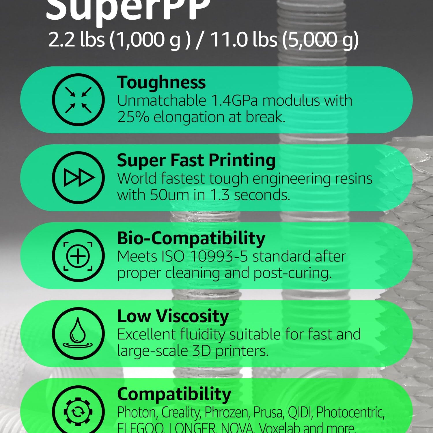 - [Tough & Durable] SuperPP has 1.4GPa tensile and 2.4GPa flexural modulus with 25% elongation at break.