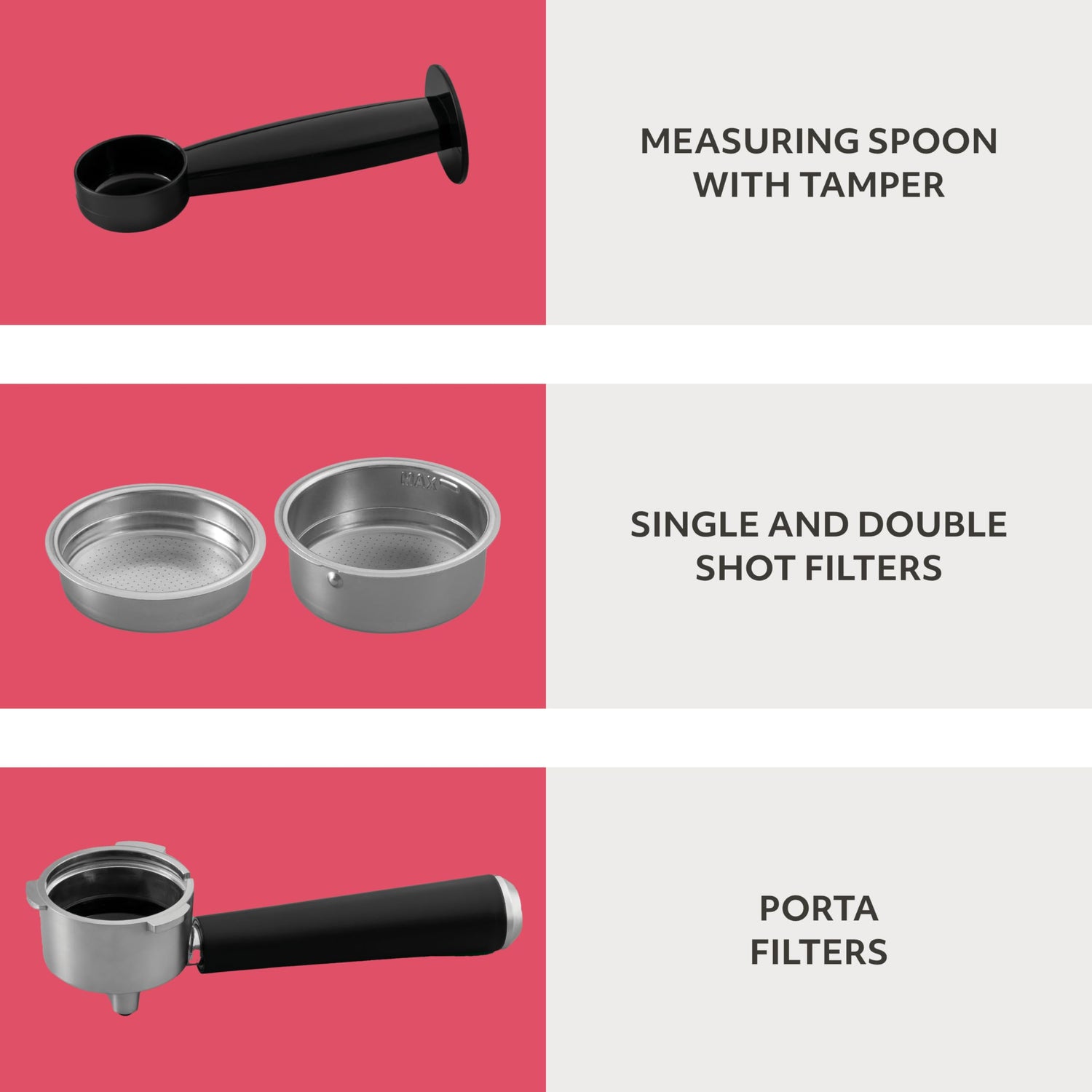 - WHAT'S INCLUDED: Your coffee arsenal includes a measuring spoon with tamper, single and double shot filters, porta filter, and a removable drip tray, making every coffee preparation a breeze.