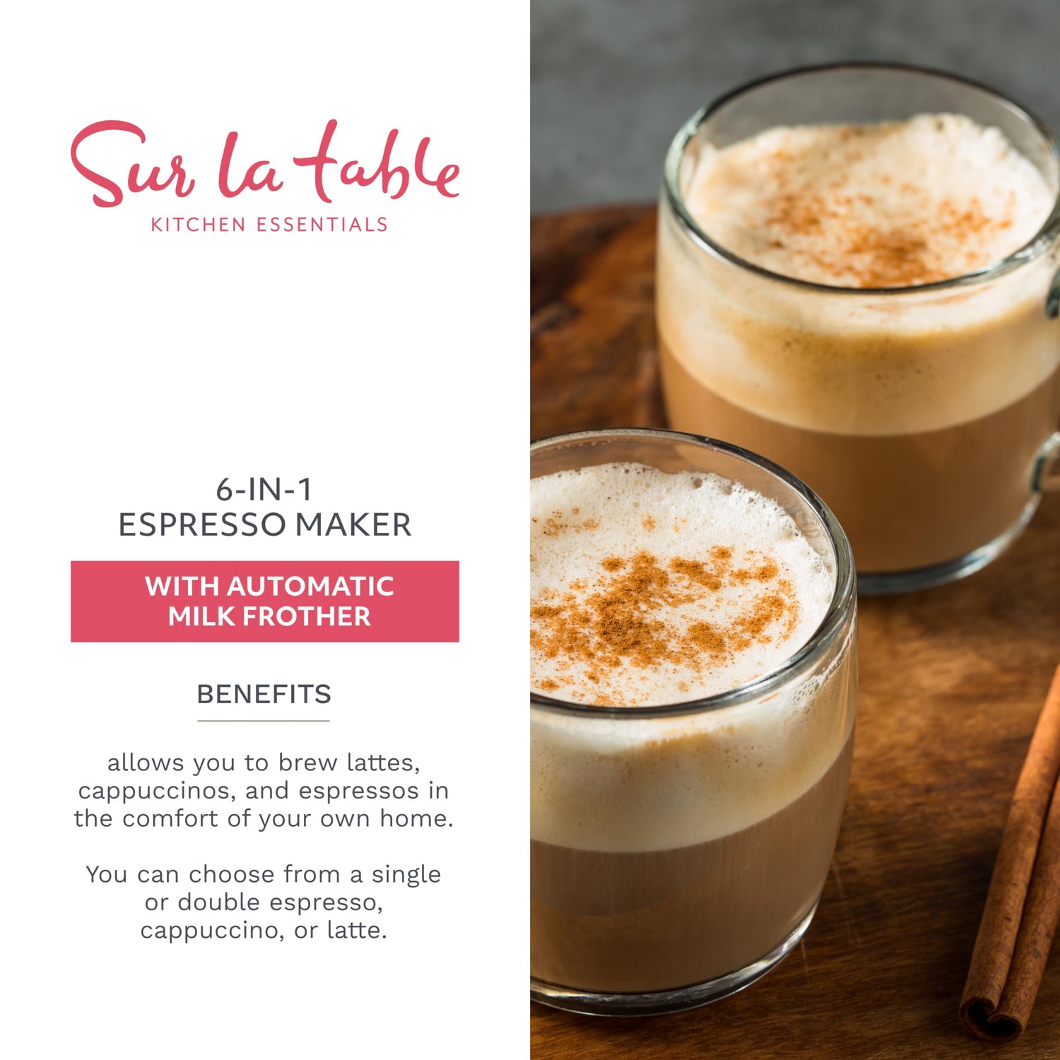 SUR LA TABLE KITCHEN ESSENTIALS 6-IN-1 Espresso Maker - Brew Lattes, Cappuccinos and Single or Double Espressos, Automatic Milk Frother and Digital LED Touchscreen Display, 1350w