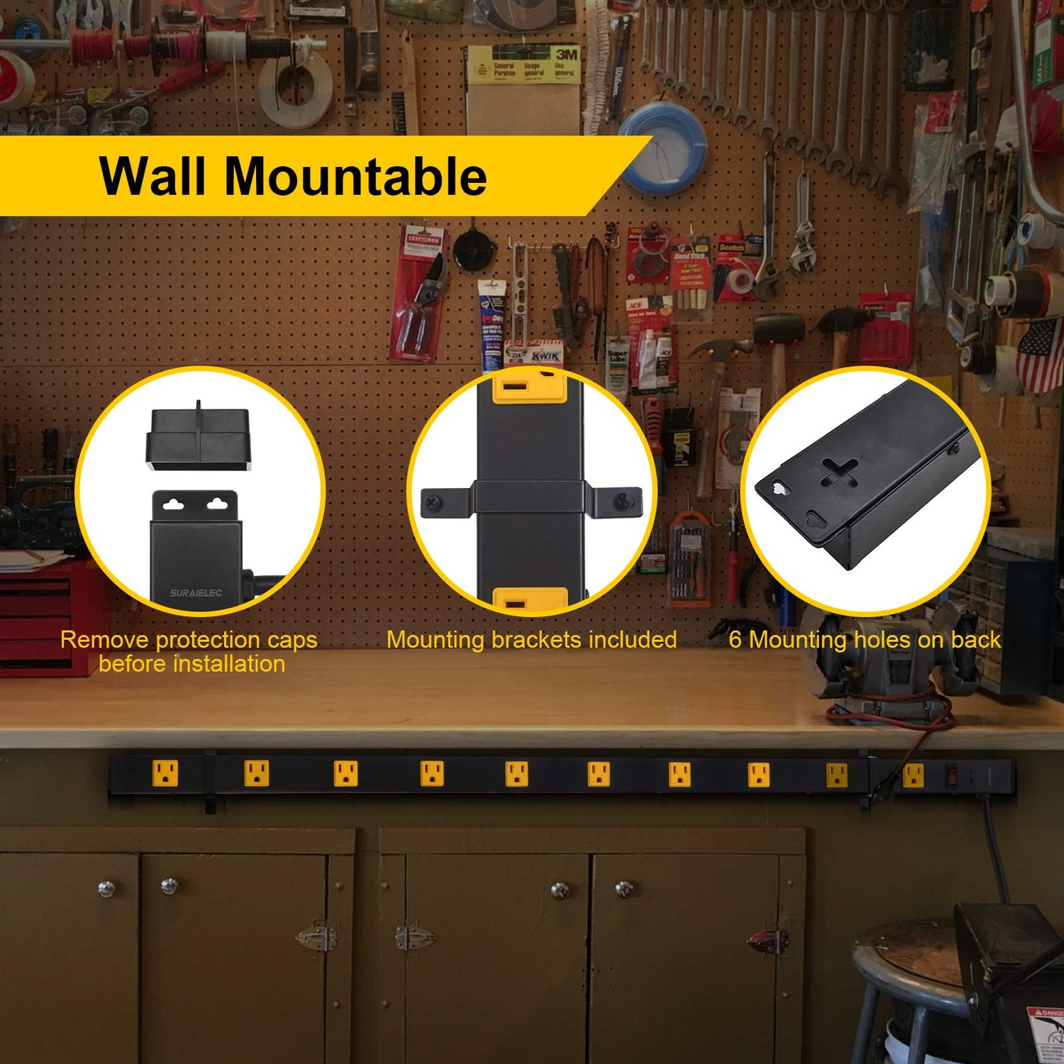 Wall Mount Power Strip Surge ProtectorComes with mounting brackets, the bench power bar strip can be easily installed to wall, desk, workbench, or cabinet tightly.Low profile right angle flat head keeps the cord close to the wall.