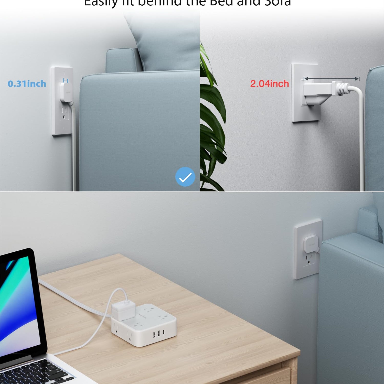- Flat Extension Cord: With only 0.31 in ultra thin flat head design, flat power strip can easily fit in tight spots and hide behind sofa, bed, nightstand or other furniture, sitting flush against the wall; 45° right angle design create an extra space for other plug below without blocking