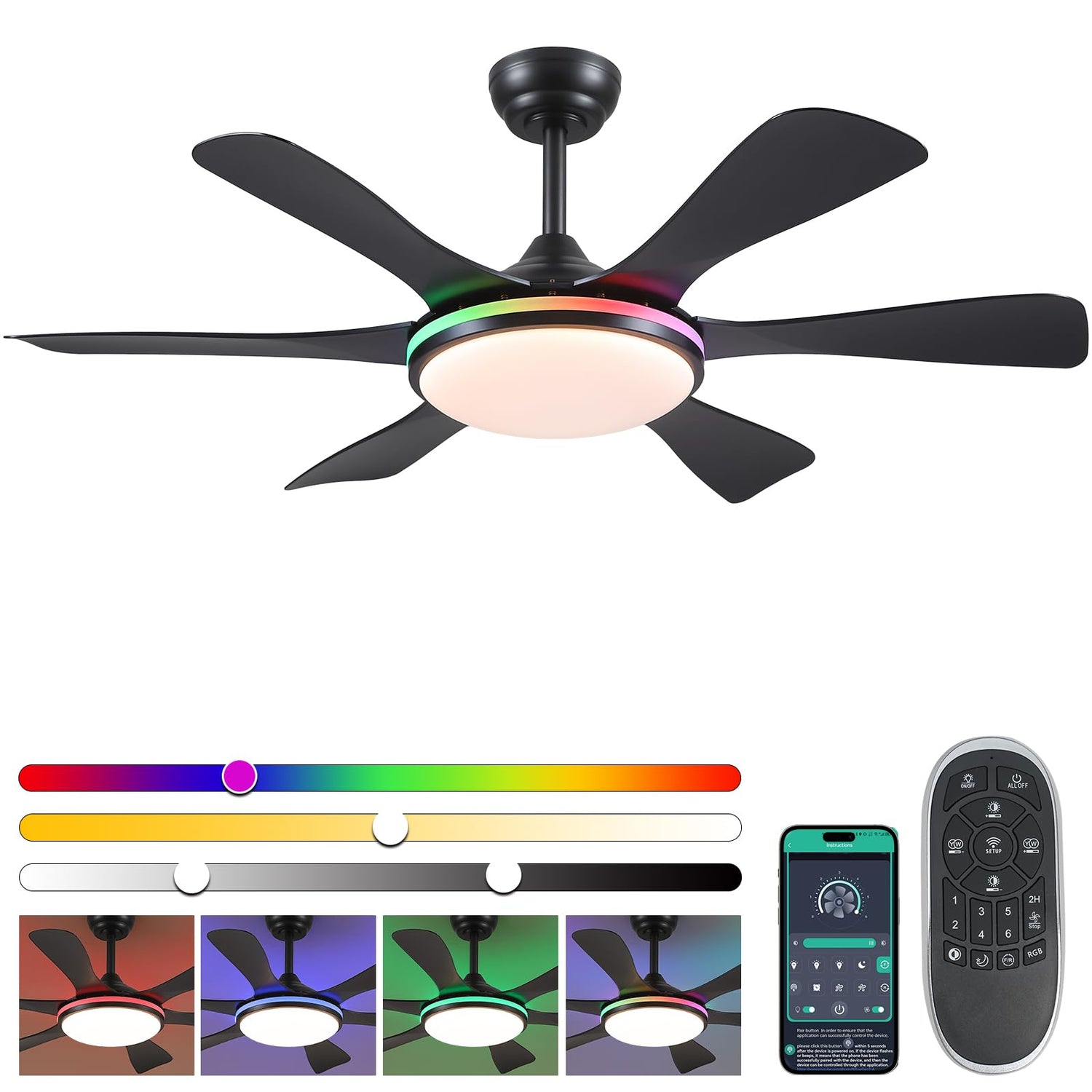 - [Ceiling Fan with APP/ Remote Control] : Controlled by APP or remote control, adjustable fan 6-level wind speed and 2-hour timing off, side RGB light and bottom 3-color light, dimming and night light mode. Includes a wall mount to keep remote on the wall for easy access. Smart App control, just scan the QR code on the manual to download the App, and control the smart fan light anytime and anywhere with your mobile phone