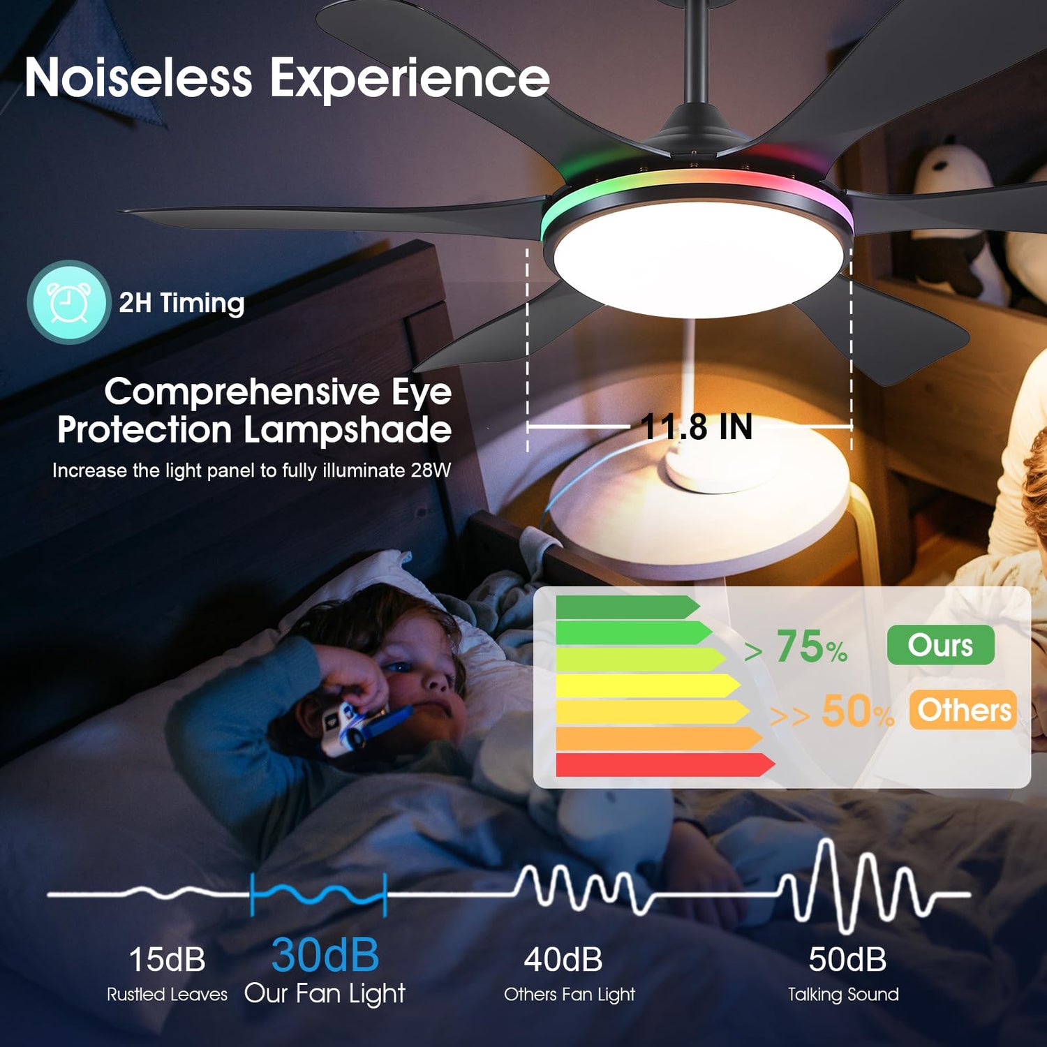 - [Ceiling Fans with RGB Lights] : This Modern 47IN ceiling fan features a dimmable lighting system that can be selected from a 3-Color temperature light (3000k-6000k) on the bottom and a 7-Color RGB light on the side, and the brightness can be adjusted from 10% to 100%. Perfect lighting that can be perfectly adapted to any environment.