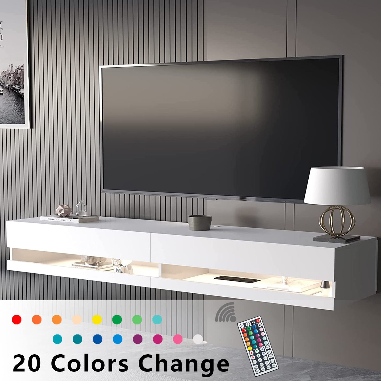 - 【Adjustable LED Lights and Power Outlets】The floating TV station is equipped with 16 color adjustable led system. In addition, TV cabinets have wire managers to hide your wires, which is convenient for wiring and convenient for customers to use electronic equipment.