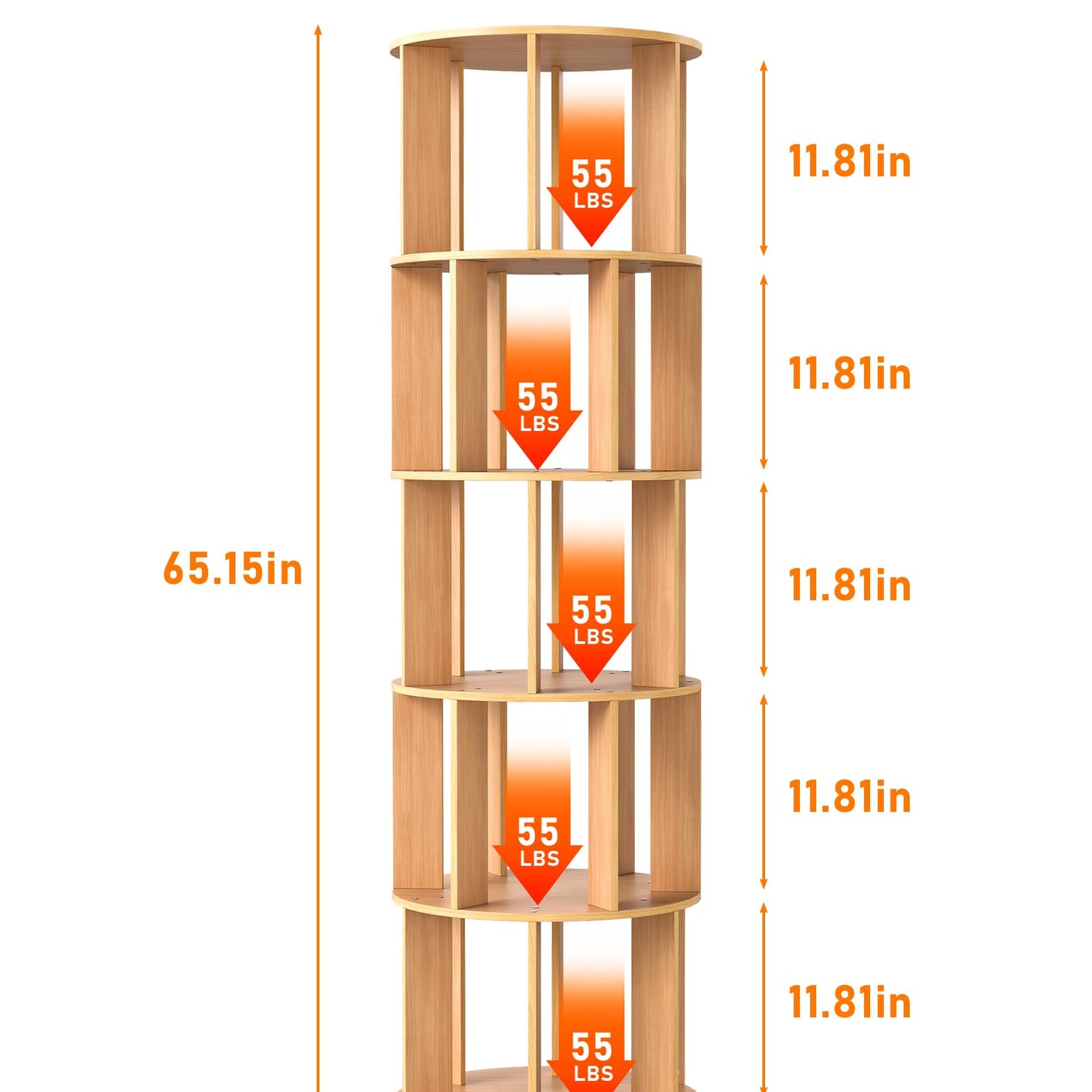 - Heavy-Duty Construction & Premium Materials:Built to last, this spinning bookshelf is crafted from 12mm thickened MDF boards.Each tier supports up to 55 lbs, ensuring stability for your heaviest books or decor. The 5-tier rotating bookcase is designed to hold 100-120 medium-sized books, making it a reliable storage solution for homes, offices, or classrooms