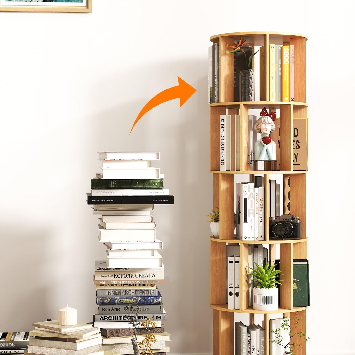 - Easy Assembly & Adjustable Shelving:Designed for hassle-free setup, this rotating storage shelf comes with clear instructions and pre-marked parts, allowing you to assemble it in under 30 minutes.The adjustable shelf height offers flexibility to accommodate taller items, while the 5-compartment tiers keep books and displays neatly organized.Whether used as a display rack or book organizer, this bookshelf adapts to your needs effortlessly