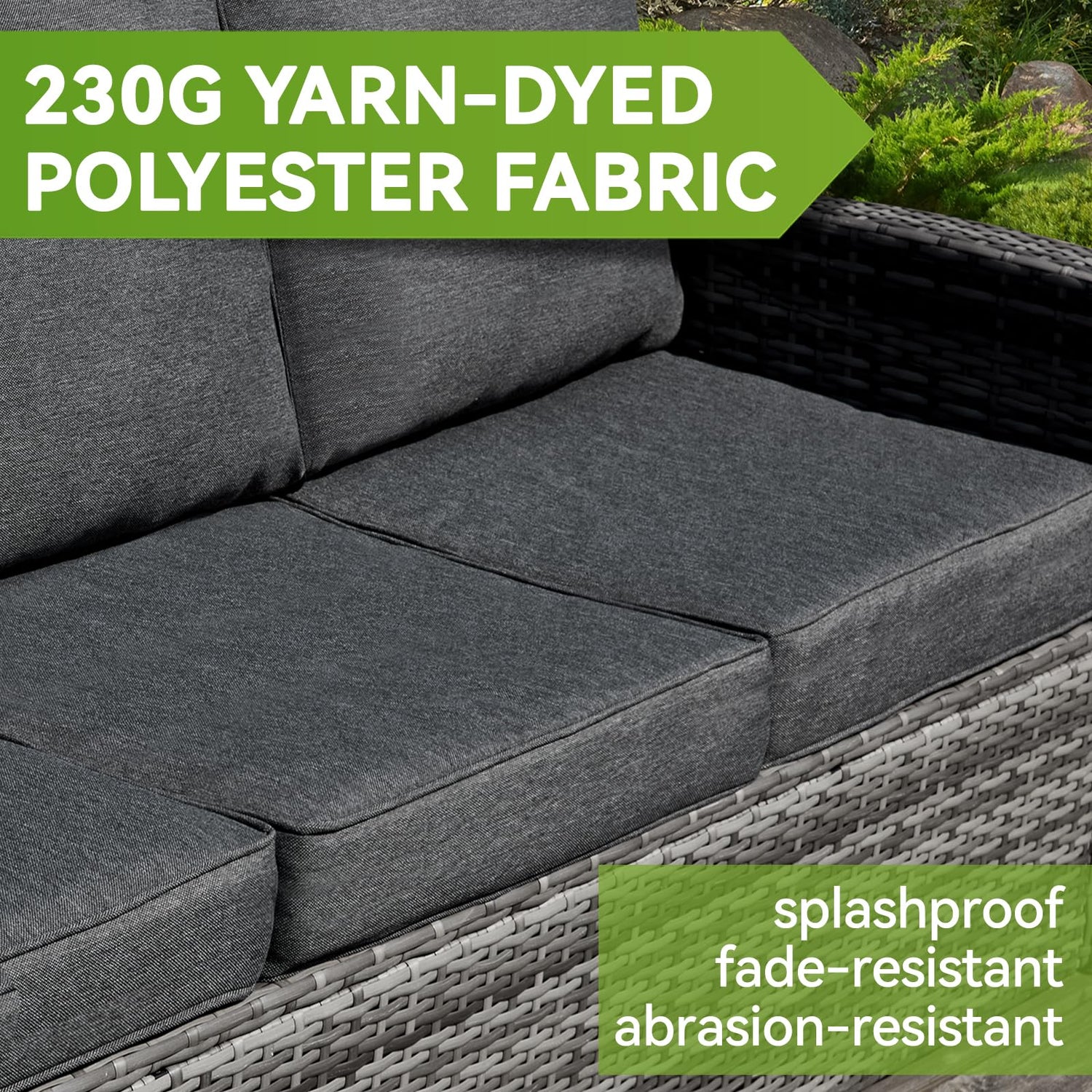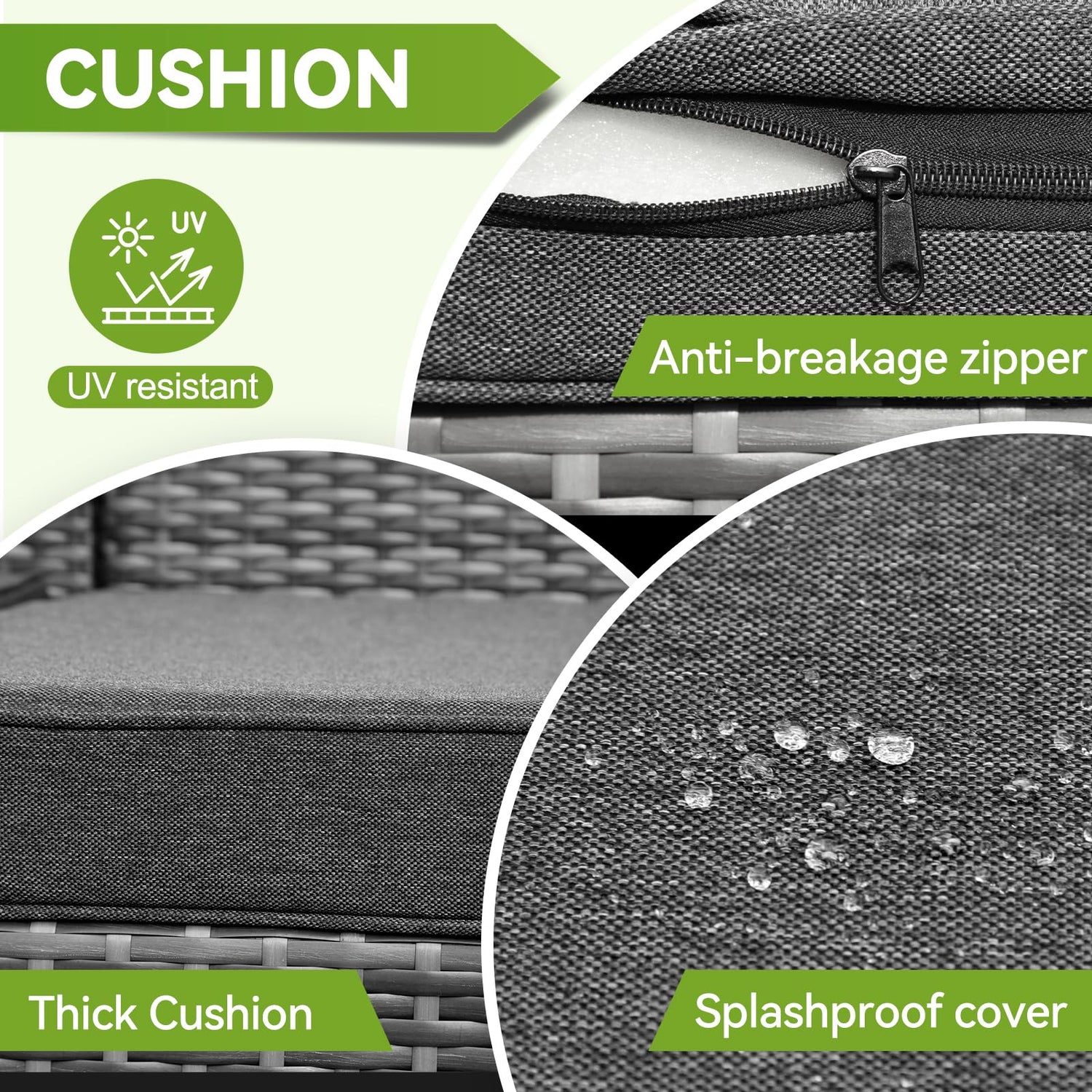 - Durability: Crafted from high-quality, all-weather-resistant PE wicker, this outdoor conversation set is designed to withstand UV radiation and various weather conditions, ensuring its integrity and resilience. This durability guarantees a prolonged lifespan and reliable performance over time.