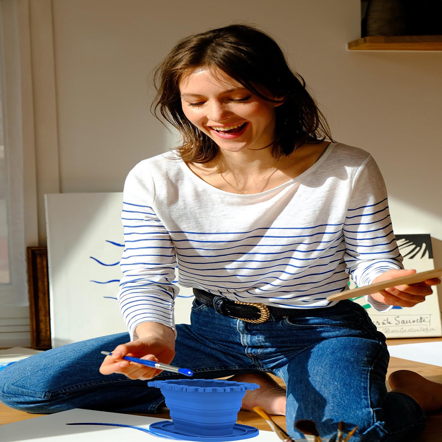 SUWARMN Paint Brush Cleaner Rinse Cup (All-in-One), Foldable Brushes Holder & Brush Cleaning Cup for Acrylic, Watercolor, and Water-Based Mediums, for Fine Art, Studio, Classroom(Blue)