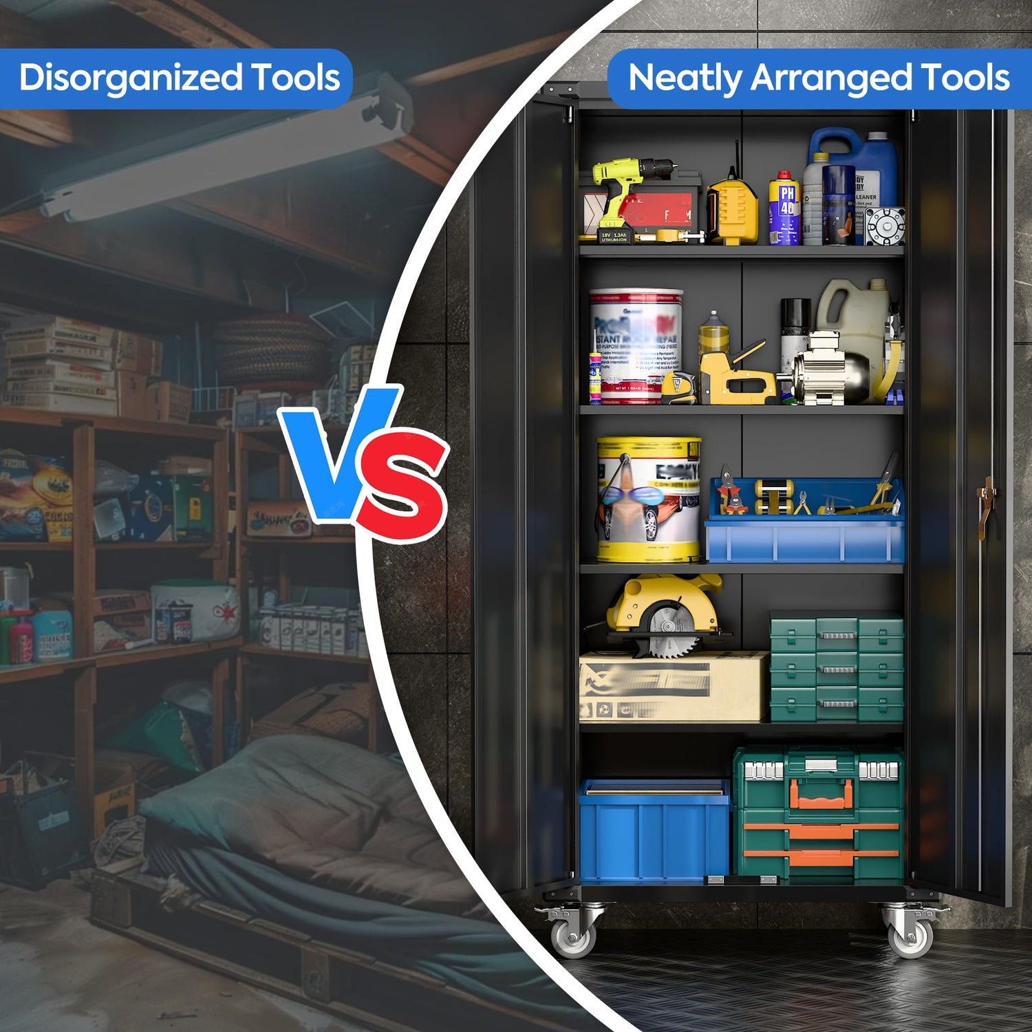 Details: SUXXAN 72" Tall Metal Storage Cabinets with Doors and 4 Adjustable Shelves, Lockable Rolling Cabinet Black, Home Office Metal Utility Cabinet for Garage Kitchen, Assembly Required