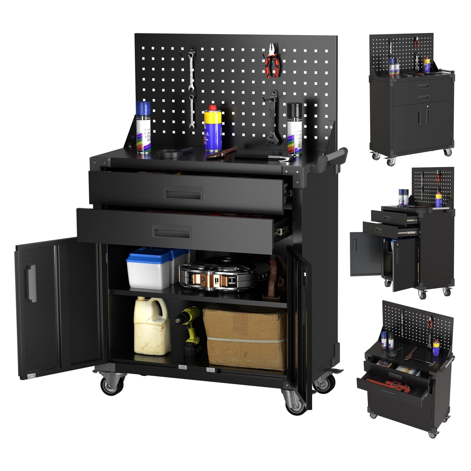 SUXXAN Black Tool Cart with Pegboard and 4 Hooks,Garage Storage Cabinet on Wheels with 2 Drawer,Industrial Service Utility Tool Cart for Mechanics, Garage, Workshop