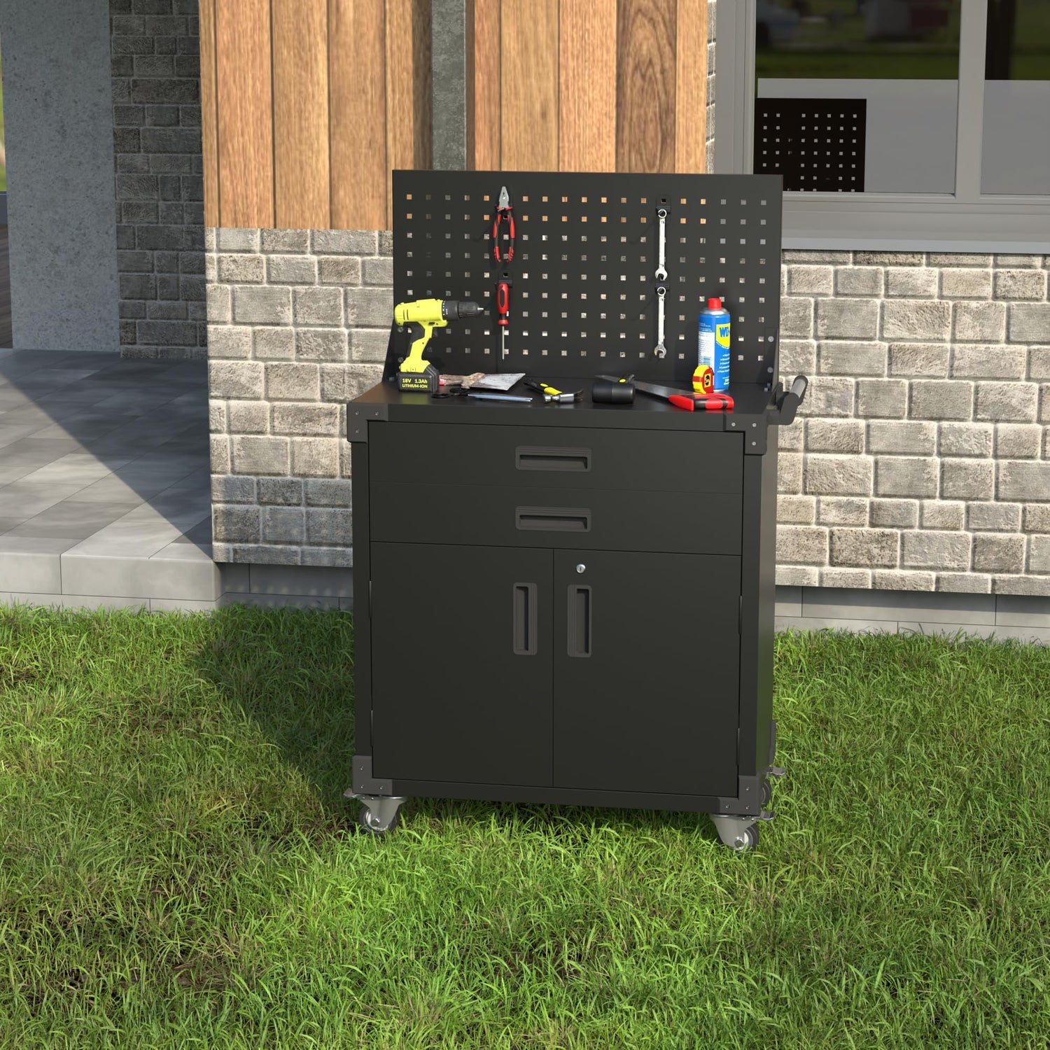 - Versatile Hole Board: Includes a 31.5" x 16.53" hole board on the top for hanging tools and accessories with the four included hooks.