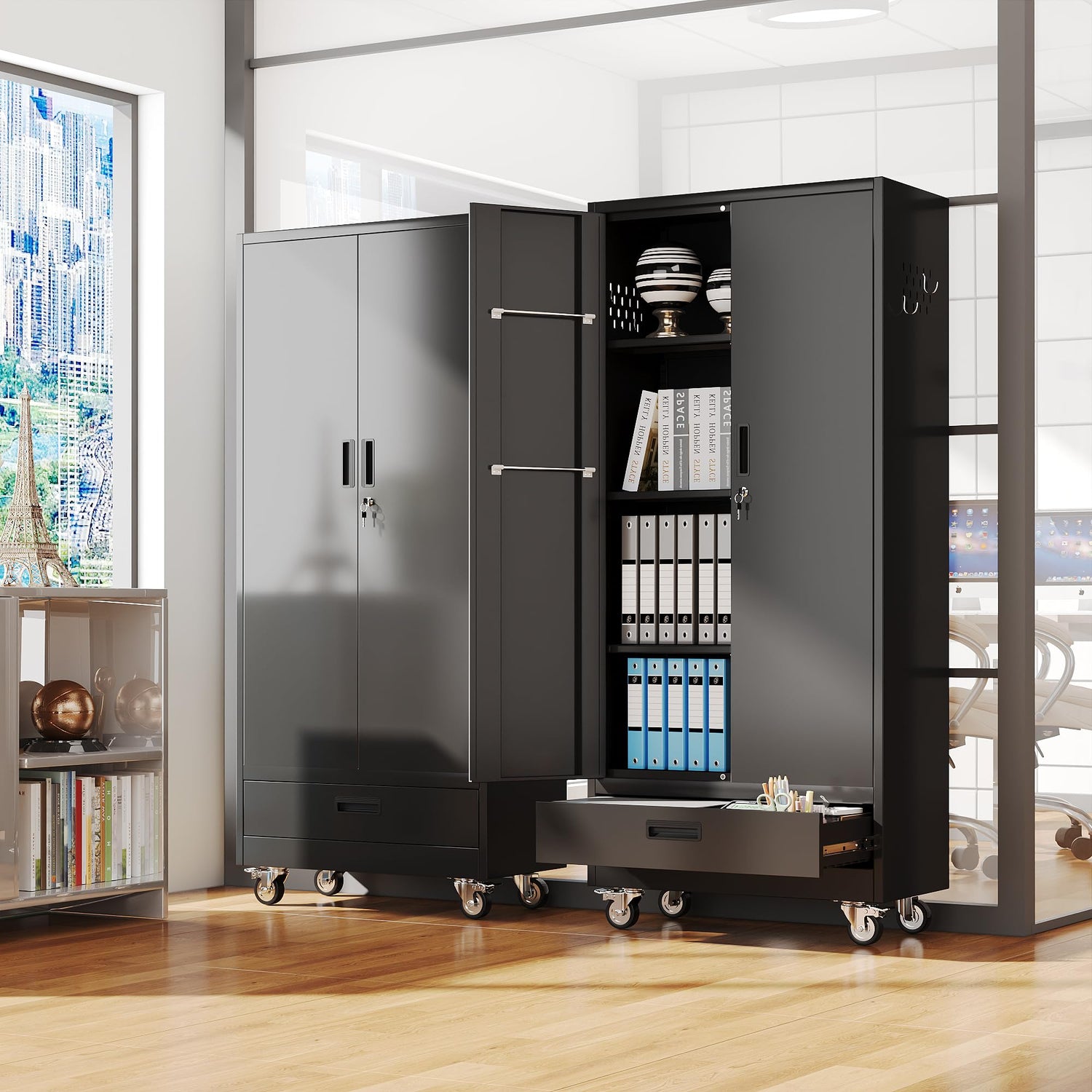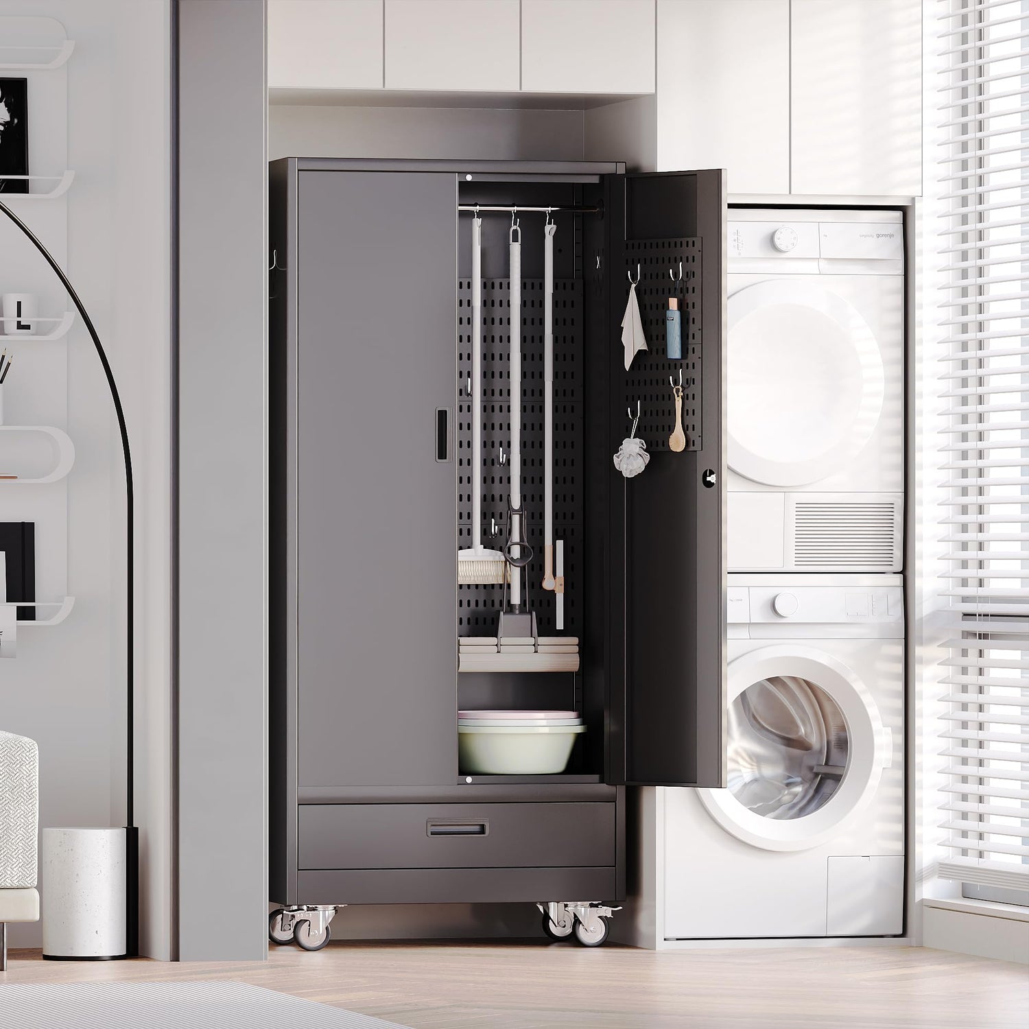 SUXXAN Broom Closet with Wheels 71"x 31.5"x15.75", Metal Cleaning Cabinets with Drawer Hooks and Hanging Rods, Lockable Cabinet with Pegboard, Adjustable Shelf,for Garage, Laundry Room