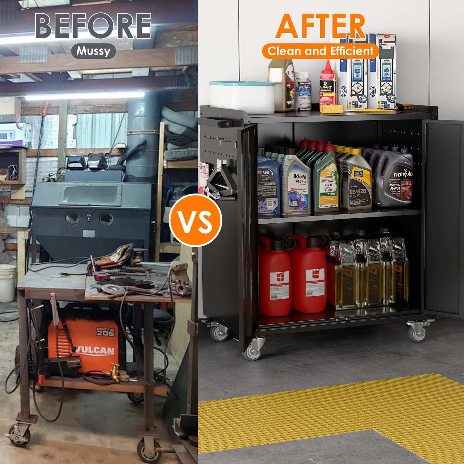 - 【Swivel Wheels】Garage cabinet on wheels equipped with 4 detachable rubber casters, including 2 lockable ones, this cabinet glides effortlessly across all surfaces. Heavy-duty wheels protect your floors from scratches, while corner protectors add an extra layer of security.