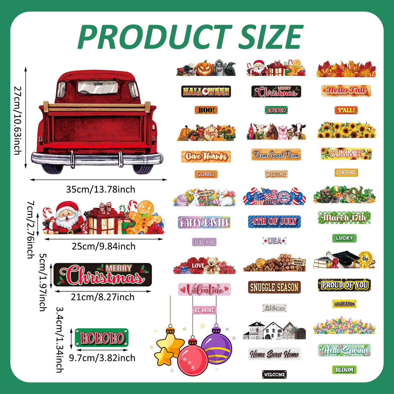Size: truck decor about 13.78 x 10.63 inches. Holiday signs about 9.84 x 2.76 inches, 8.27 x 1.97 inches, and 3.82 x 1.34 inches