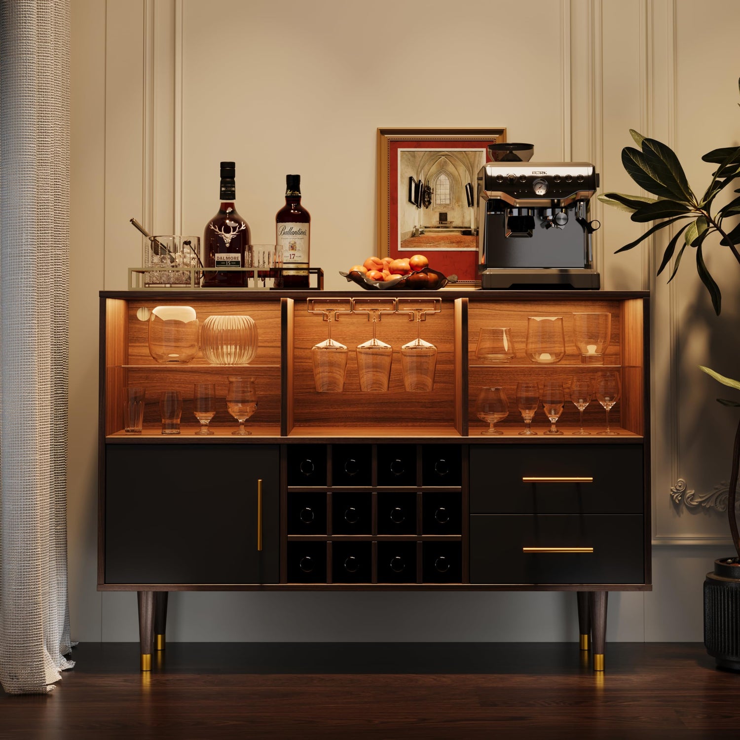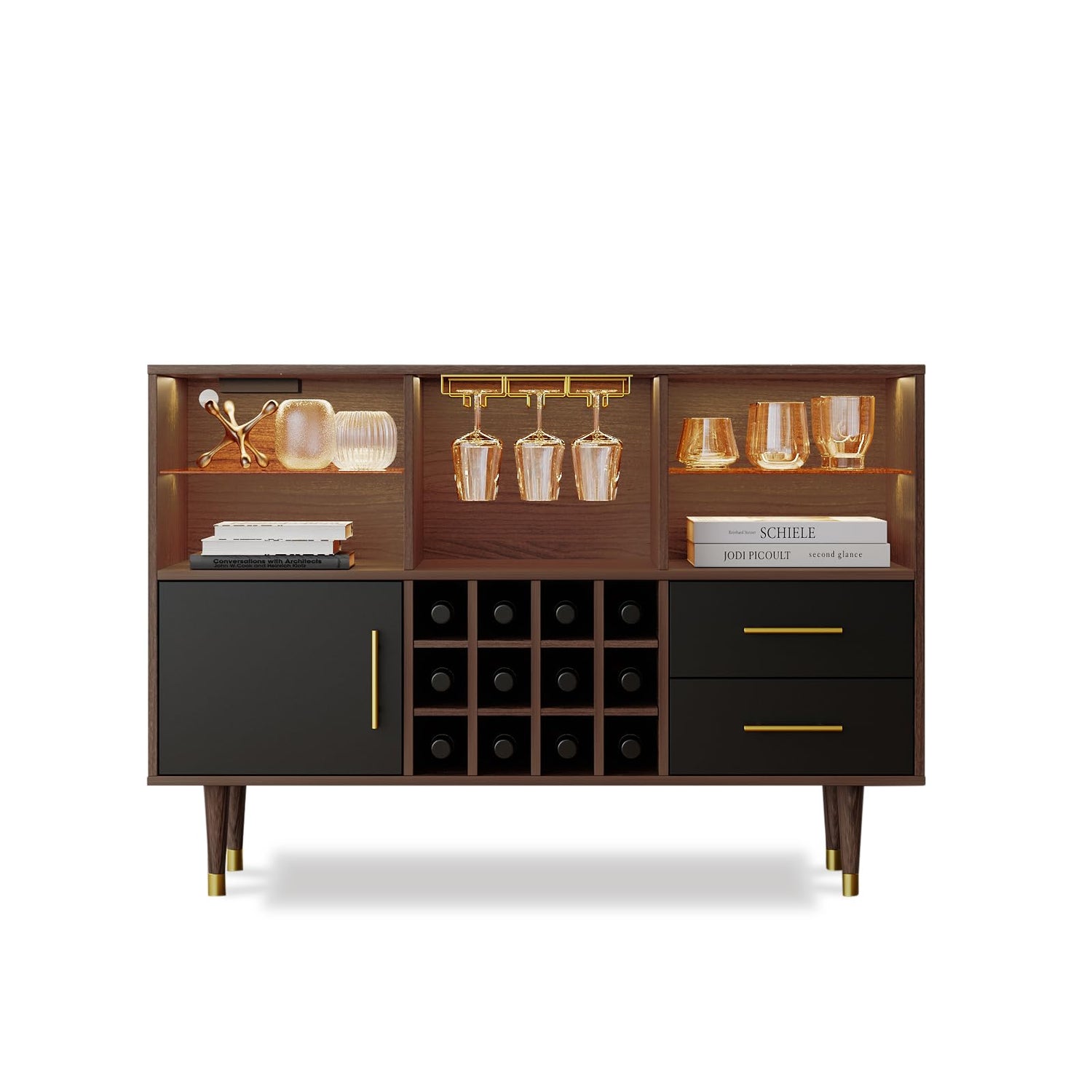 Svimi Bar Cabinet, 47 inch Walnut - Modern Cabinet with LED Light Charging Station, Buffet Table, Coffee Bar & Storage for Home Bar