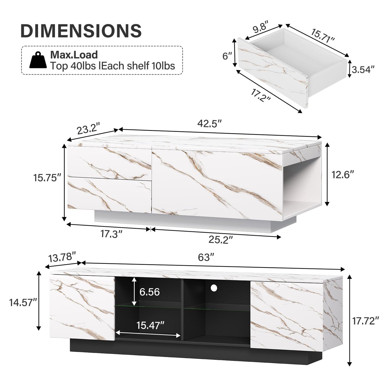 - Living room furniture is made of 16mm thick high-quality P2 grade particleboard, which is more robust and load-bearing than most materials on the market. TV stand size: 63*13.78*17.72inch. Coffee table size: 42.5*23.2*15.75inch.