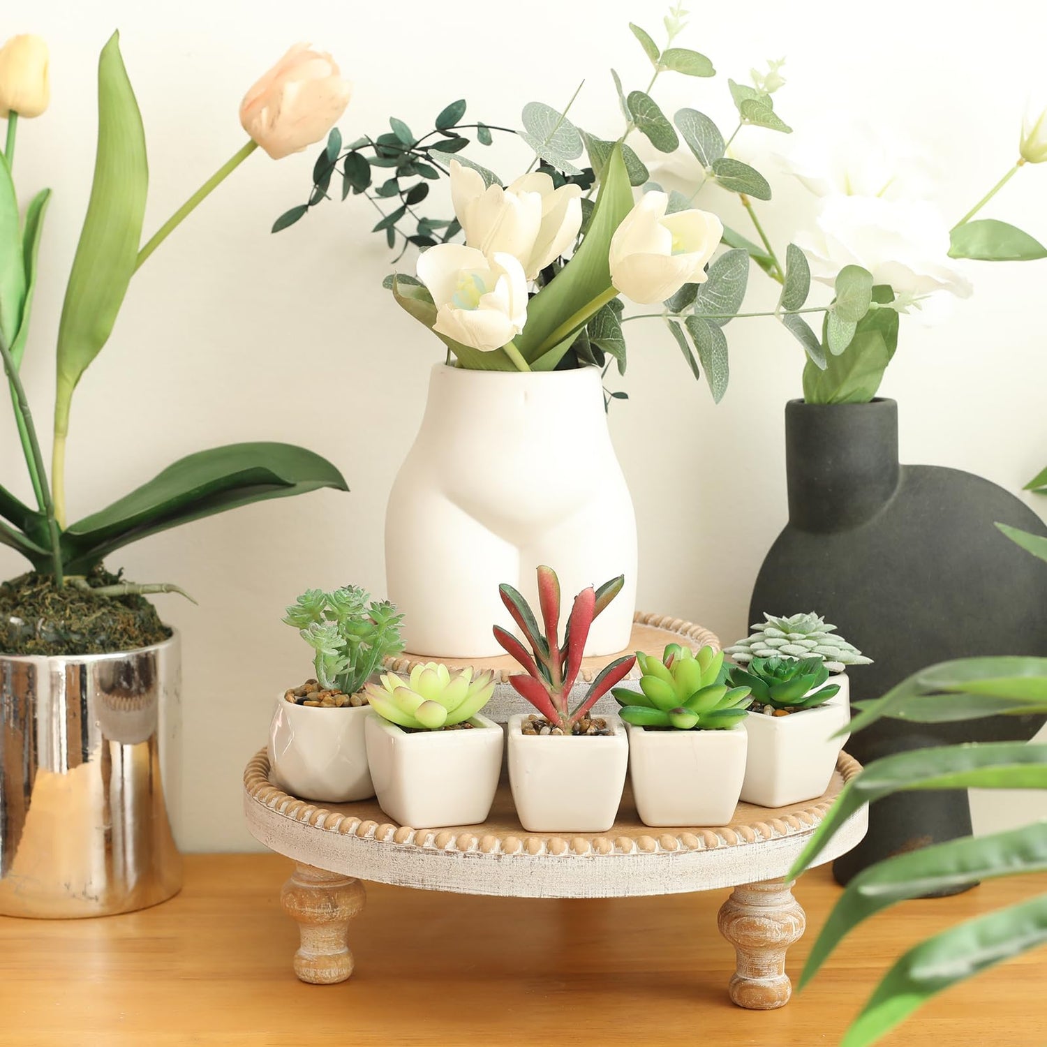 - [Wooden Finish]- With its Wooden finish, our footed display pedestal stand exudes a charming weathered and sun-bleached effect, adding a touch of rustic elegance to any setting.