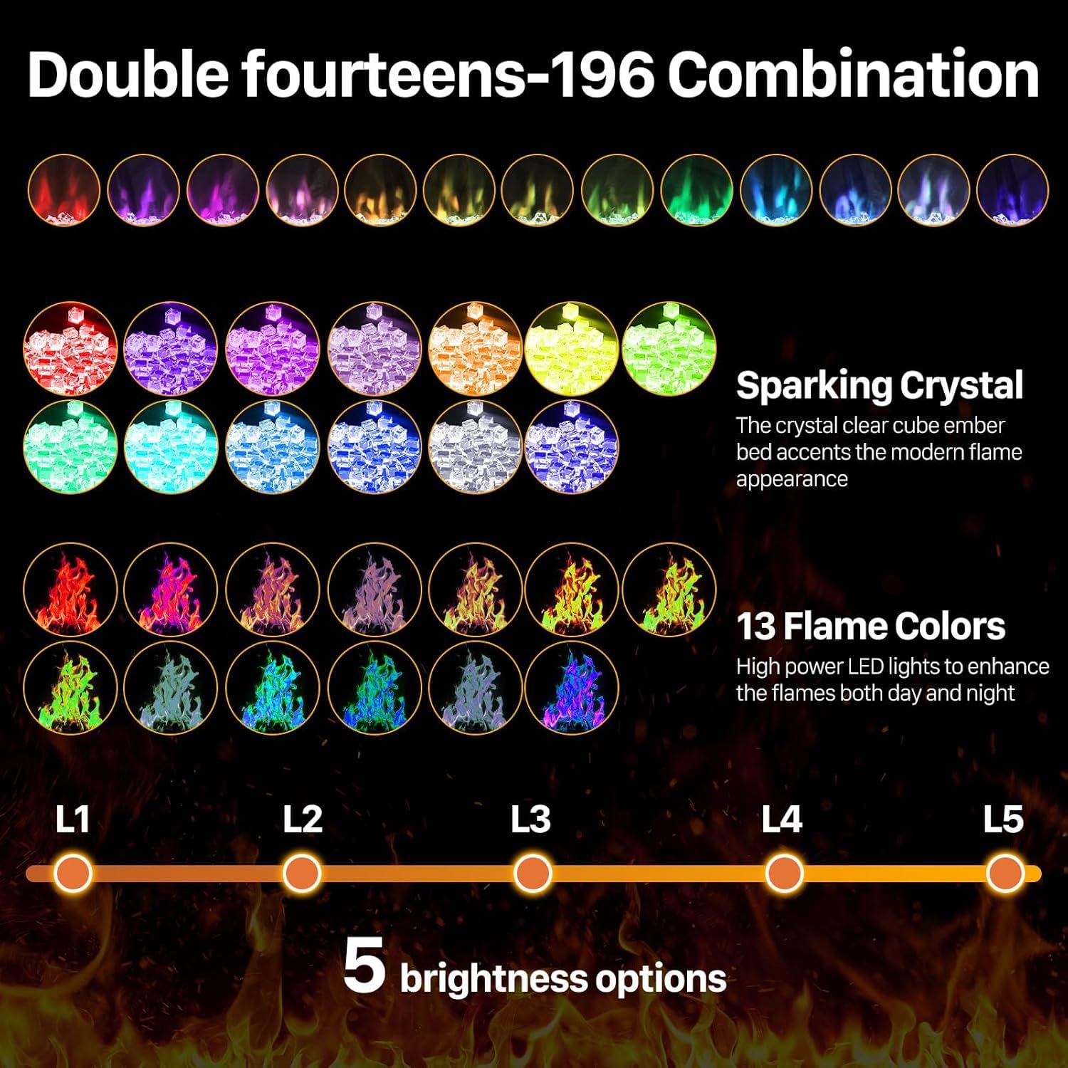 - 169 Color Options: Experience the unique ambiance of this electric fireplace heater, which not only simulates realistic flames but also offers an impressive 13 flame and 13 carbon colors. The exciting color cycle mode changes the flame and carbon colors every 3s, adding endless vibrancy to your space. You can also choose to illuminate the flames and carbon separately, with 6 brightness levels and 5 speed settings available to effortlessly customize your ideal flame effect.