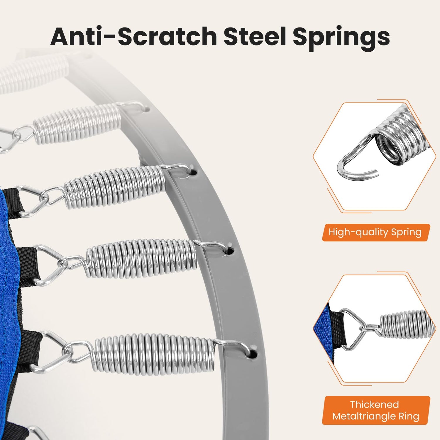 • Adjustable Bar: Rebounder trampoline comes with adjustable height handles. The handles also come with a non-slip material that prevents slipping or falling during use, increasing the safety of the trampoline. The trampoline with adjustable bar allows you to enjoy the fun of bouncing on the trampoline with more peace of mind, and at the same time effectively protects your own safety
