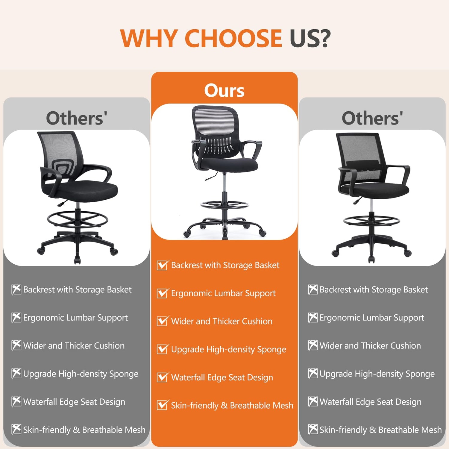 - 【Ergonomic Lumbar Support】- The ergonomically designed backrest of our standing desk chair has prominent lumbar support to fit the natural curvature of the spine, and keeps you in a good seating posture. Besides, the backrest features with a back storage basket, making this high office chair more beautiful and practical.
