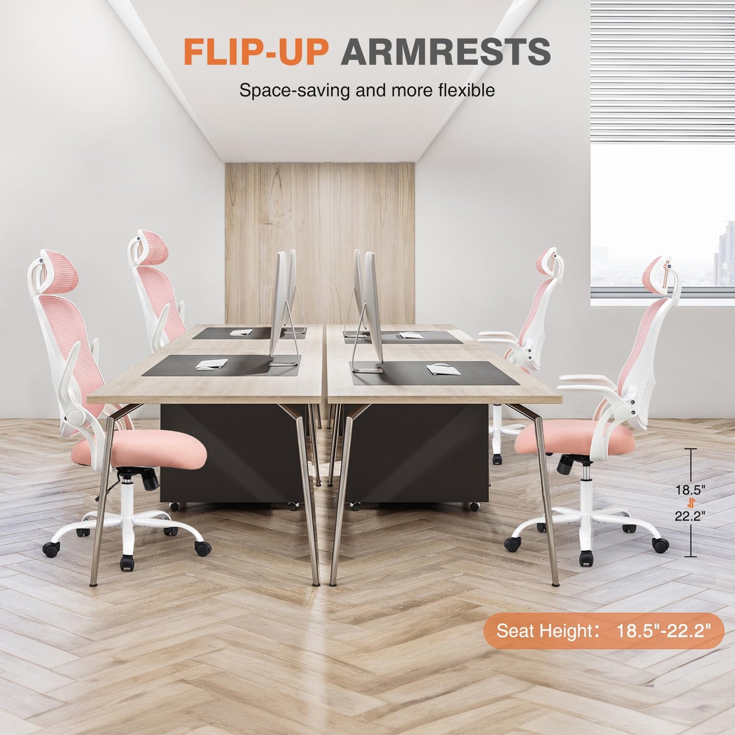 Sweetcrispy Office Computer Desk Chair, Ergonomic High-Back Mesh Rolling Work Chairs with Wheels and Adjustable Headrests, Comfortable Lumbar Support, Comfy Flip-up Arms for Home,Bedroom,Study, Pink