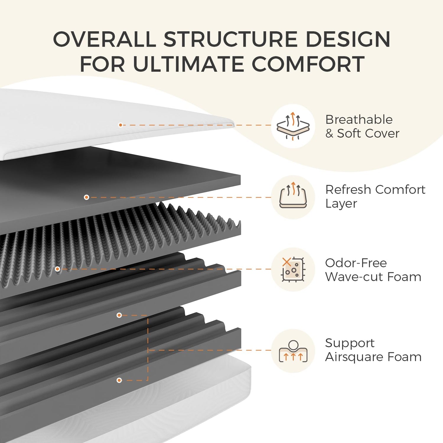 - ULTRA BREATHABLE & COZY: The breathable fabric cover of plush full memory foam mattress provides a cool, smooth touch to your skin and the Wave-cut Foam will effectively dissipate your body heat, reducing heat accumulation. Meanwhile, the AirSquare Support Foam has much extra air space, which means it can improve breathability. Say goodbye to hot sleep and enjoy ultra-breathable sleep.