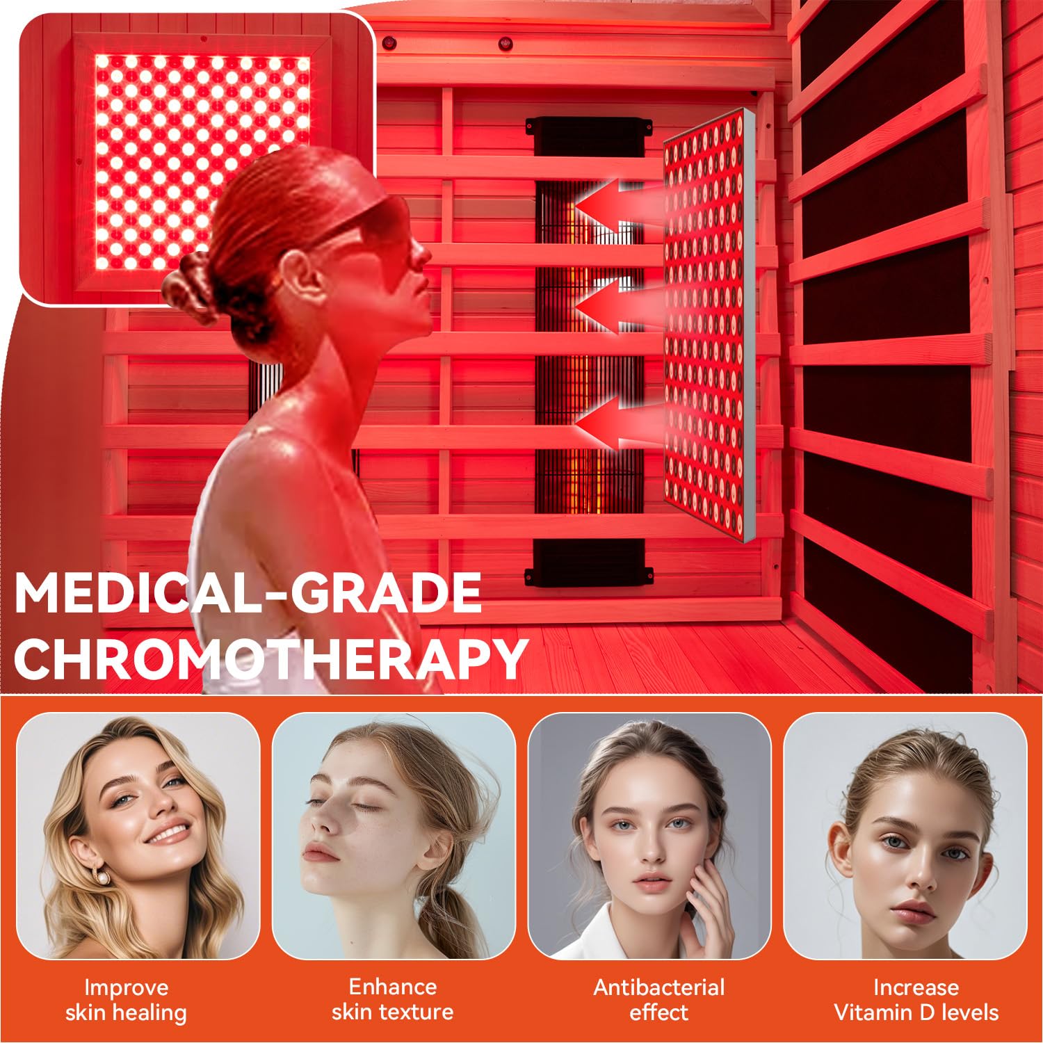 - 【Upgraded Red Light Therapy Lamp】Our indoor 2 person sauna has an upgraded red light therapy lamp equipped with 113 light beads, and the wavelength of 660nm is close to the body's own wavelength, which is more easily absorbed by your skin, promoting healing and rejuvenation, so that you can enjoy regular professional skin management at home without going to the beauty salon.