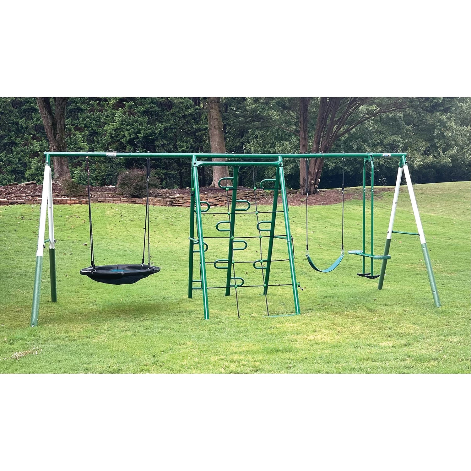 Details: XDP Recreation's Swing, Climb and Glide Play Center has unique metal and rope climbing wall stations that are designed to generate dexterity, coordination and adventure! This Play Center is constructed of a Steel Frame and includes a Super Disc Swing for two, a Sling Swing Seat, an Ultra Air-Glider for up to two, a Painted Metal Designed Climbing Wall, a Rope Designed Climbing Wall, and Frame Post Foam Leg Covers for Child Safety. The Swing, Climb and Glide Play Center is a 5 station, 4 leg frame swing set that accommodates up to 7 kids. The frame legs are 2” diameter x 20-gauge wall thickness, top bar is 2” diameter x 20-gauge thickness. It's colors are as follows. A green and white steel frame color, a green slider seat, a green seated Air Glider, a black and green Super Disc, and green foam frame leg padding. Up to 7 Kids can play on the Swing, Climb and Glide Play Center at once with a 100lbs per seat/play maximum. 700lbs maximum at one time on the set. Designed and engineered for Parents ‘safe and fun’ thoughts for their kids. Age range for each child is 3 years to 8 years. Assembled dimensions are 176" L x 69" Deep x 73" H. This Play Center weighs 128lbs. Adult assembly is required.
