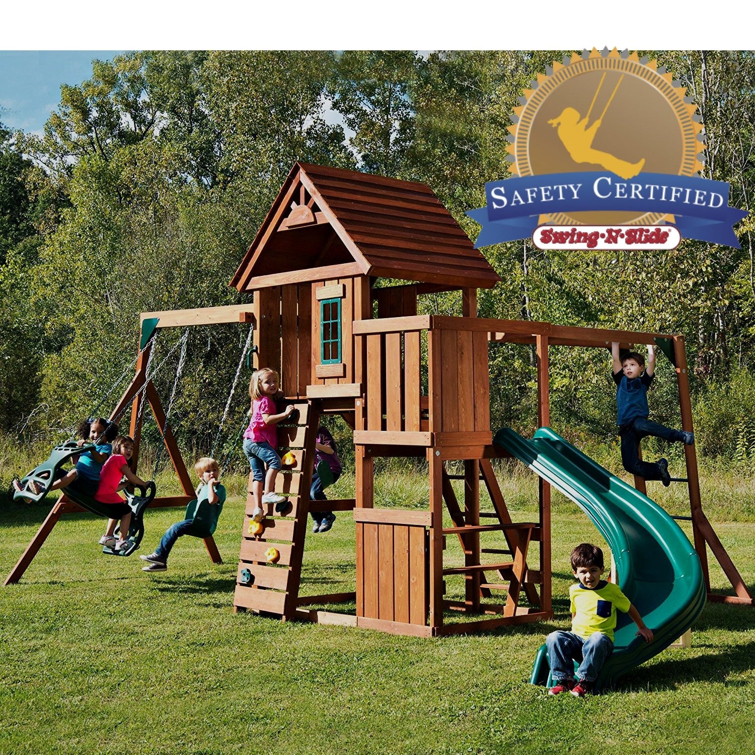 Swing-N-Slide PB 8272 Cedar Brook Wooden Swing Set Play Set with Two Swings, Slide, Monkey Bars, Picnic Table & Glider, Green