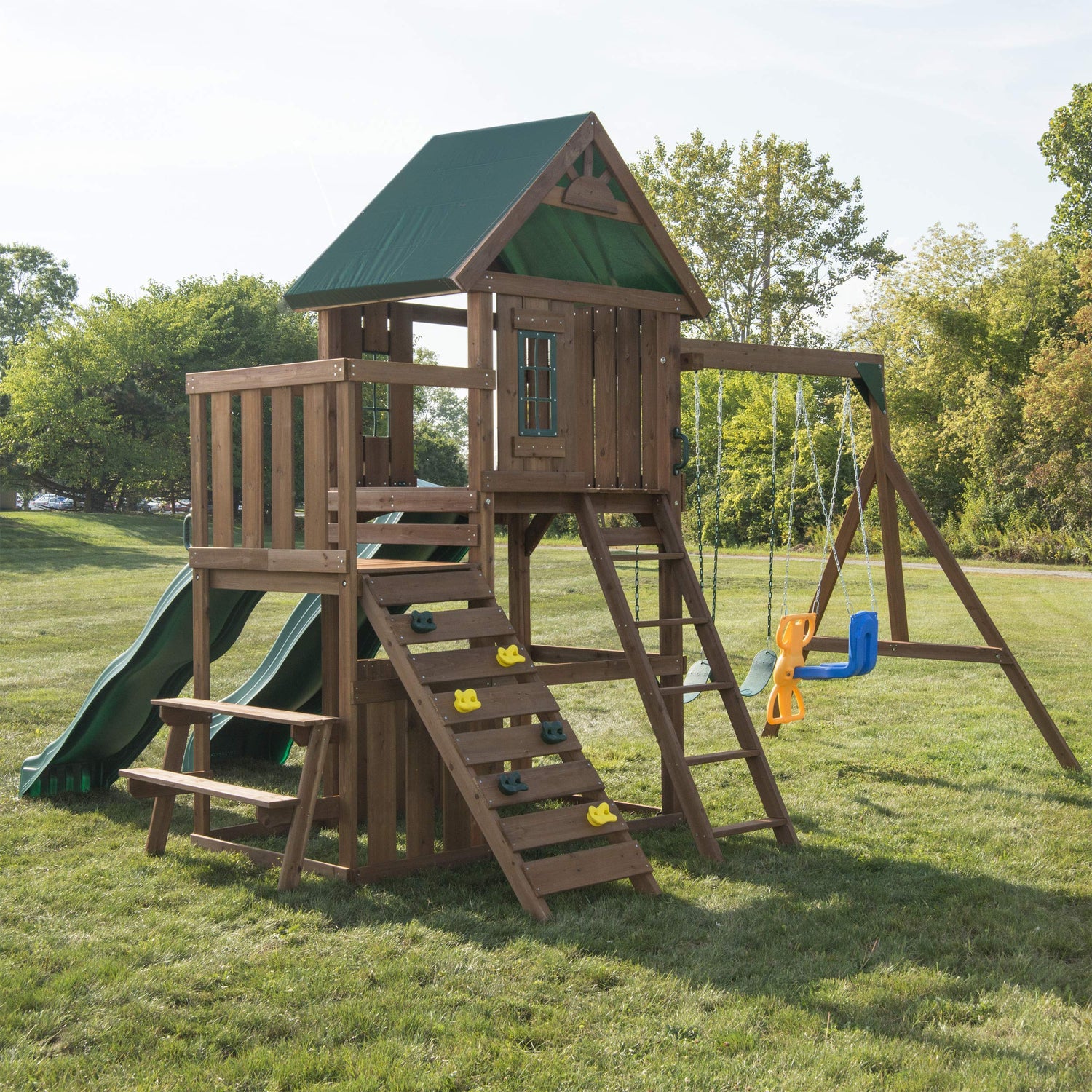 Details: Create an instant play land with the Willows peak deluxe Wood complete play set by Swing-N-Slide. This backyard swing set features two swing seats with coated chain and a wind rider glider, each Designed to support up to 115 pounds. Designed to Compliment any yard, this kit features a decorative roof with sunburst gable and two windows. Includes the cool wave slide and the Alpine wave slide, each backed by a lifetime warranty against cracks and breaks. Two play deck heights include a climbing rock wall, ladder, picnic table and much more. All pre-cut, pre-stained lumber, hardware, and instructions are included.