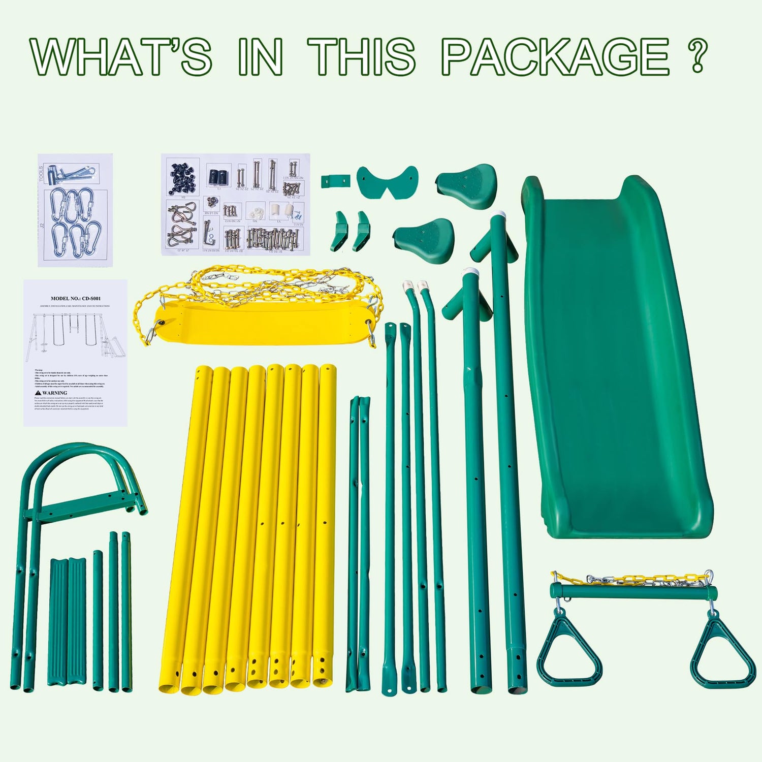 - Outdoor Combo Swingset for Kids: Includes 2 height adjustable belt swing, 1 trapeze bar, 1 Glider, 1 Slide; Multiple play projects allow kids to choose and change their favorite items. 550 lbs weight capacity, fun for the whole family to play