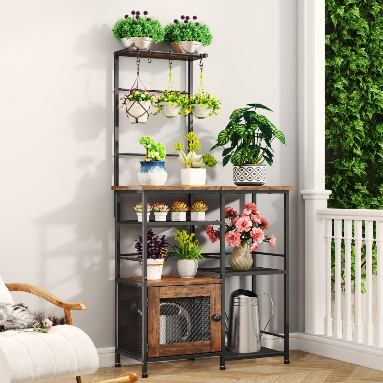 - [Hidden Cabinet, Clutter-Free Charm]: With a closed mesh cabinet and wood-textured front, this coffee nook helps conceal your supplies for a neat, modern look. Use the coffee station table to display décor, while the bottom compartments hide less aesthetic items. Great as a dual-purpose small bakers rack and balcony green plant rack for form and function