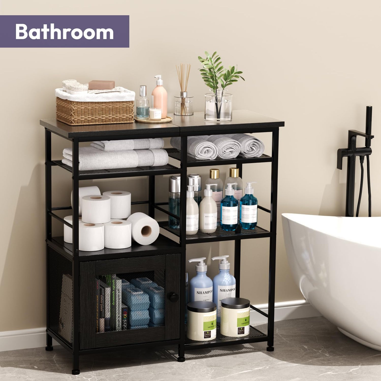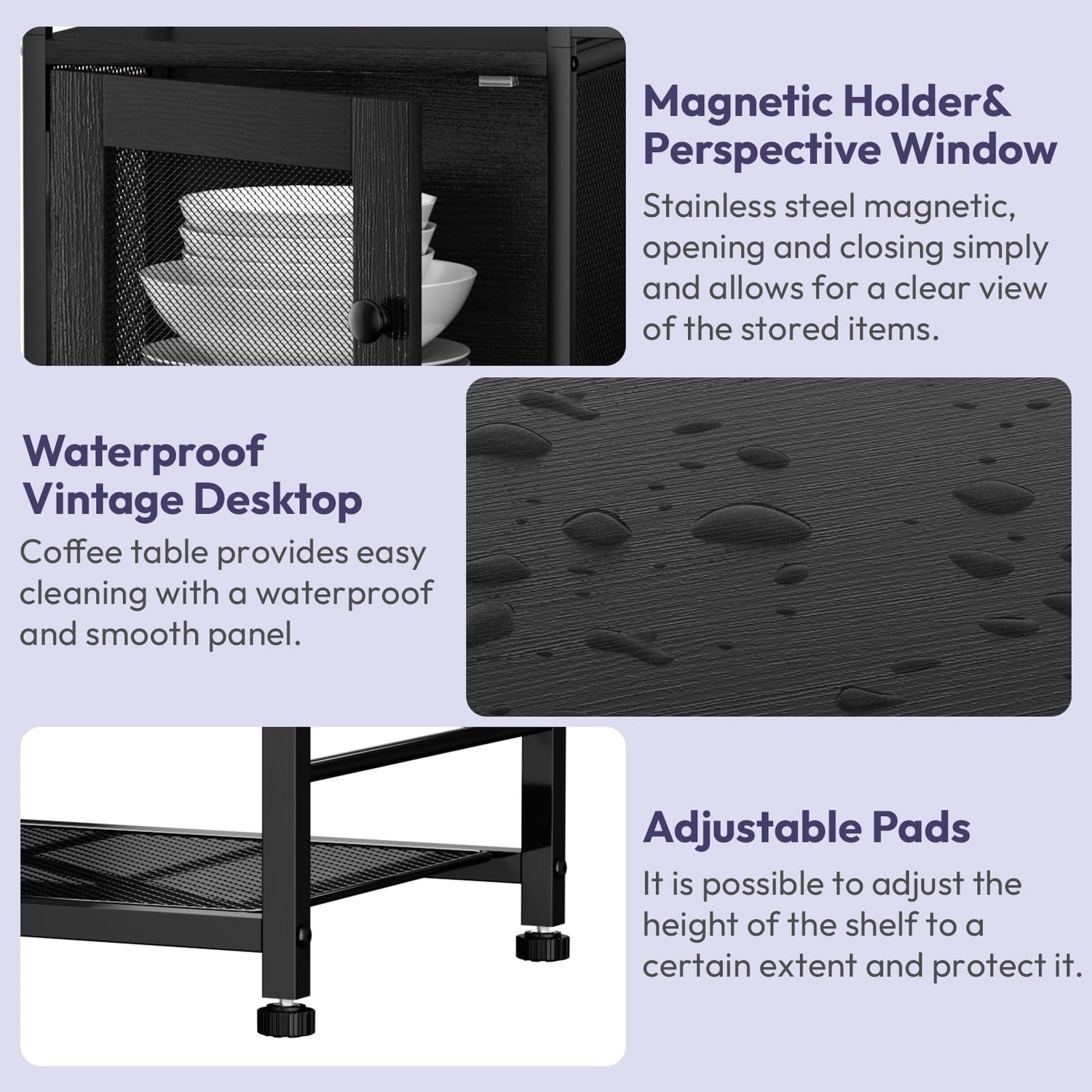 - [Flexible 7-Tier Storage] Kitchen coffee station with storage features a mesh shelf, and cabinet door, offering diverse storage solutions in one compact unit. Organize mugs, utensils, or coffee machines efficiently—coffee cabinet ideal as a small bar cabinet or coffee corner station in homes or offices