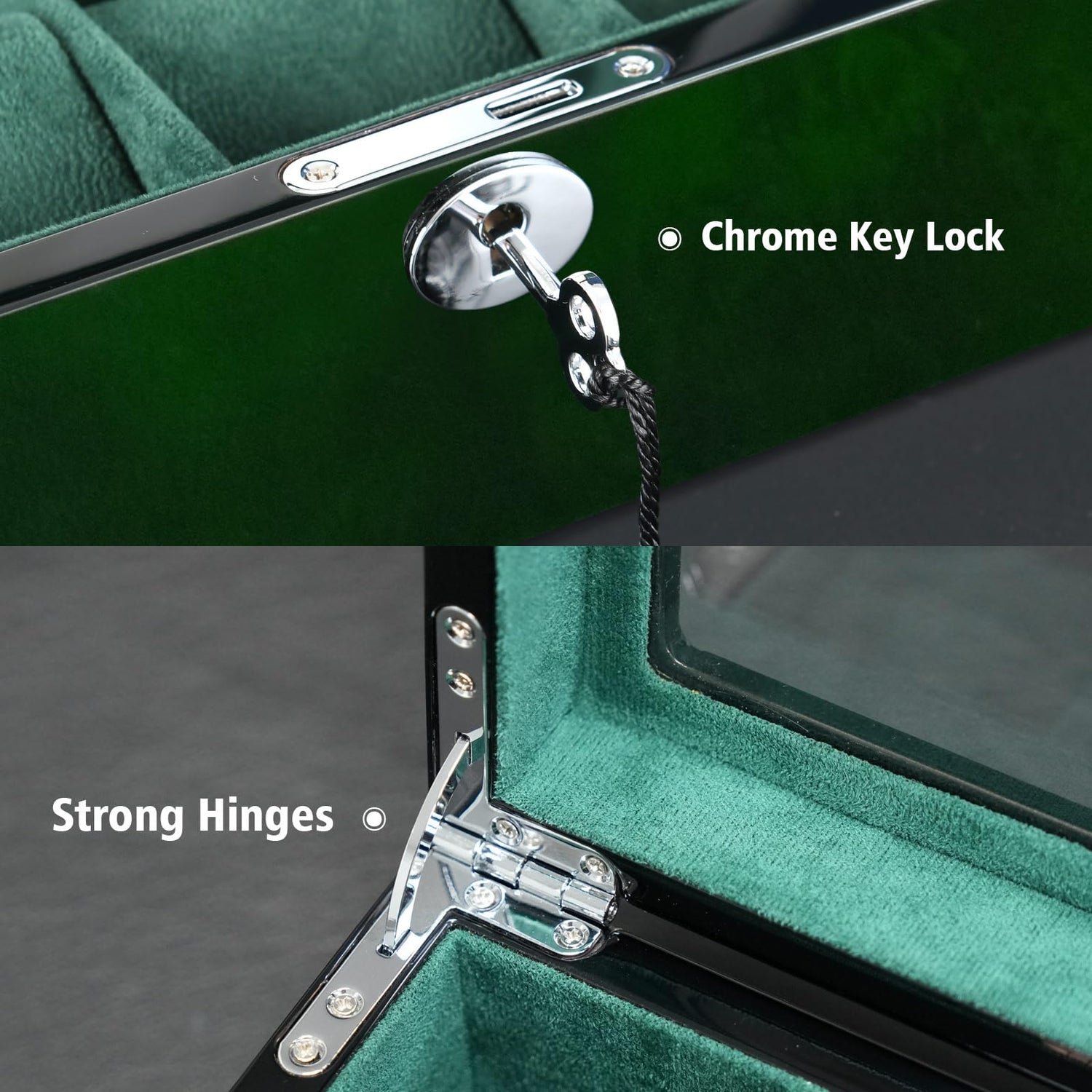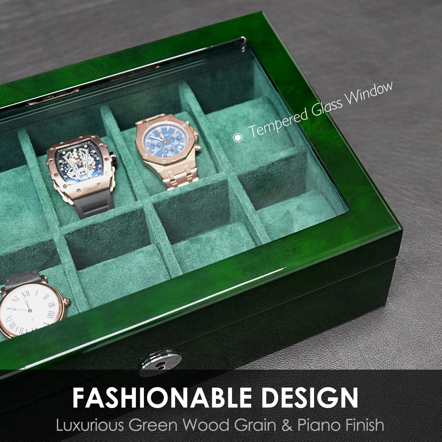 - WATCH BOX HIGHLIGHTS: Green ebony piano paint, the paint surface is full, smooth and textured, and it looks very luxurious at first glance. The interior is equipped with dark green Suede, the material is delicate and feels good, which is not comparable to ordinary watch boxes on the market! chrome hardware key lock is standard.