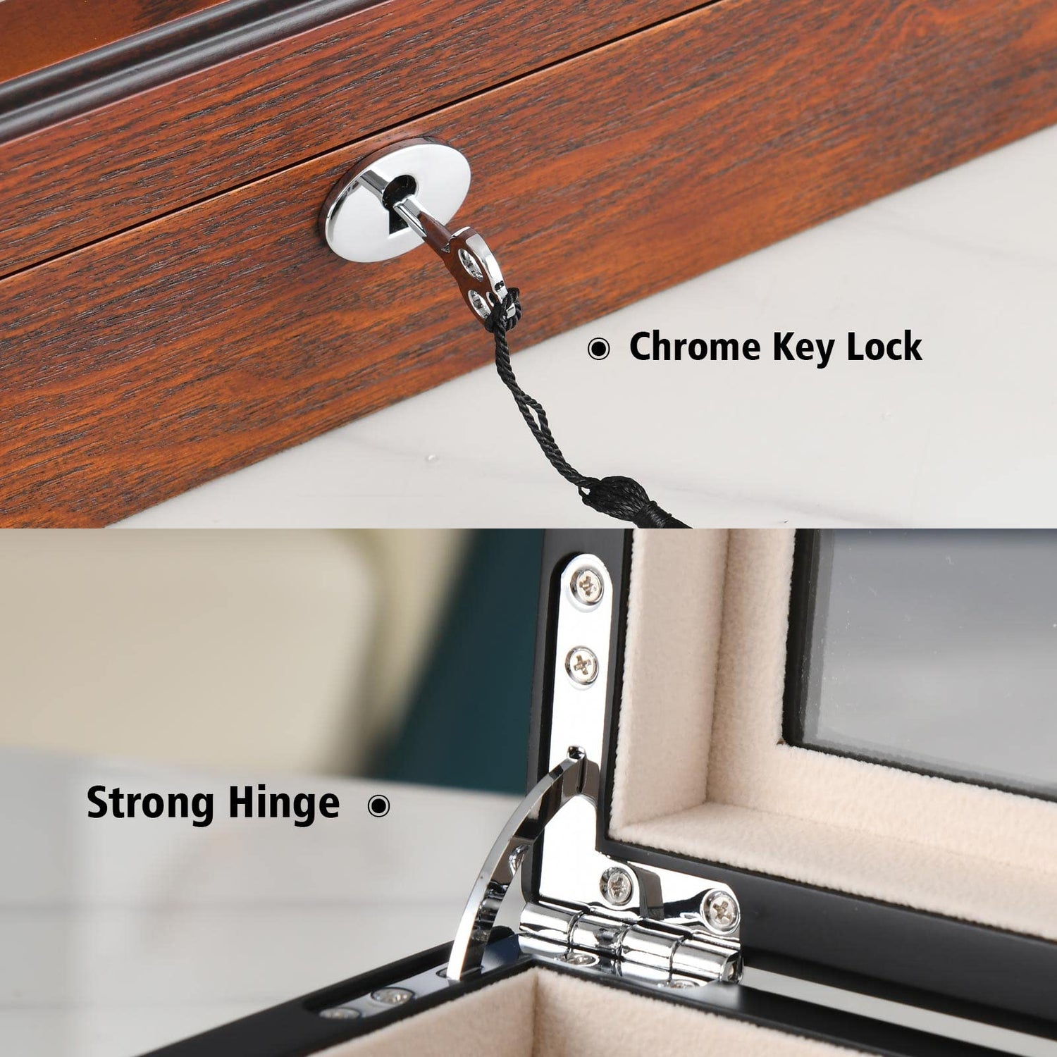 - WOOD MATERIAL: -We have good source of materials. The glass on the top is made of high-quality real glass, and the box is made of natural wood material, making it look more advanced. Different with other glasses box, our sunglassed box's inner is made of premium Velvet that can well protect your items.