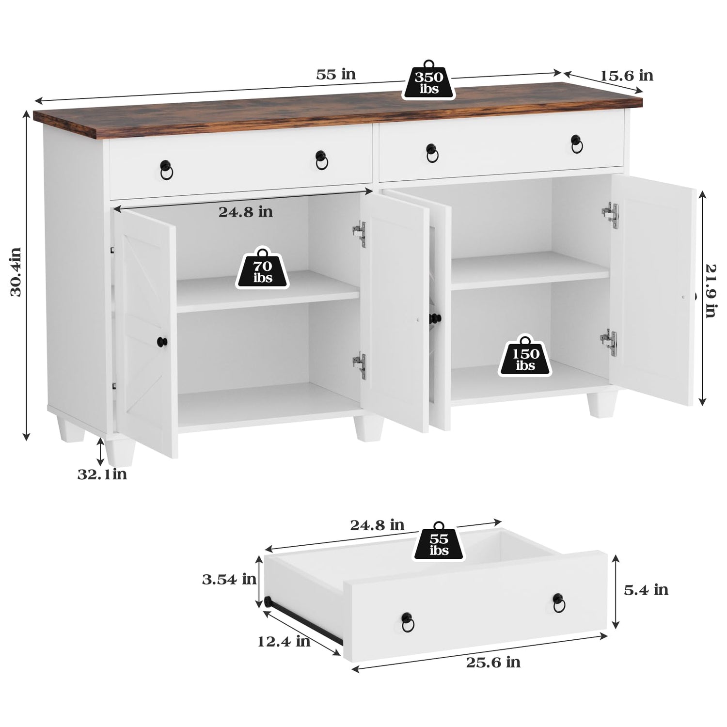 This buffet cabinet with storage can make your kitchen items just as organized as you want them to be! You can do not worry about it. The white buffet table can easily match your furniture. 6 legs make this buffet sideboard more sturdy. The credenza storage cabinet can hold up to 220 pounds . The design of anti-tip mechanism, guarantees the white buffet cabinet is safe while fully loaded. Feature: