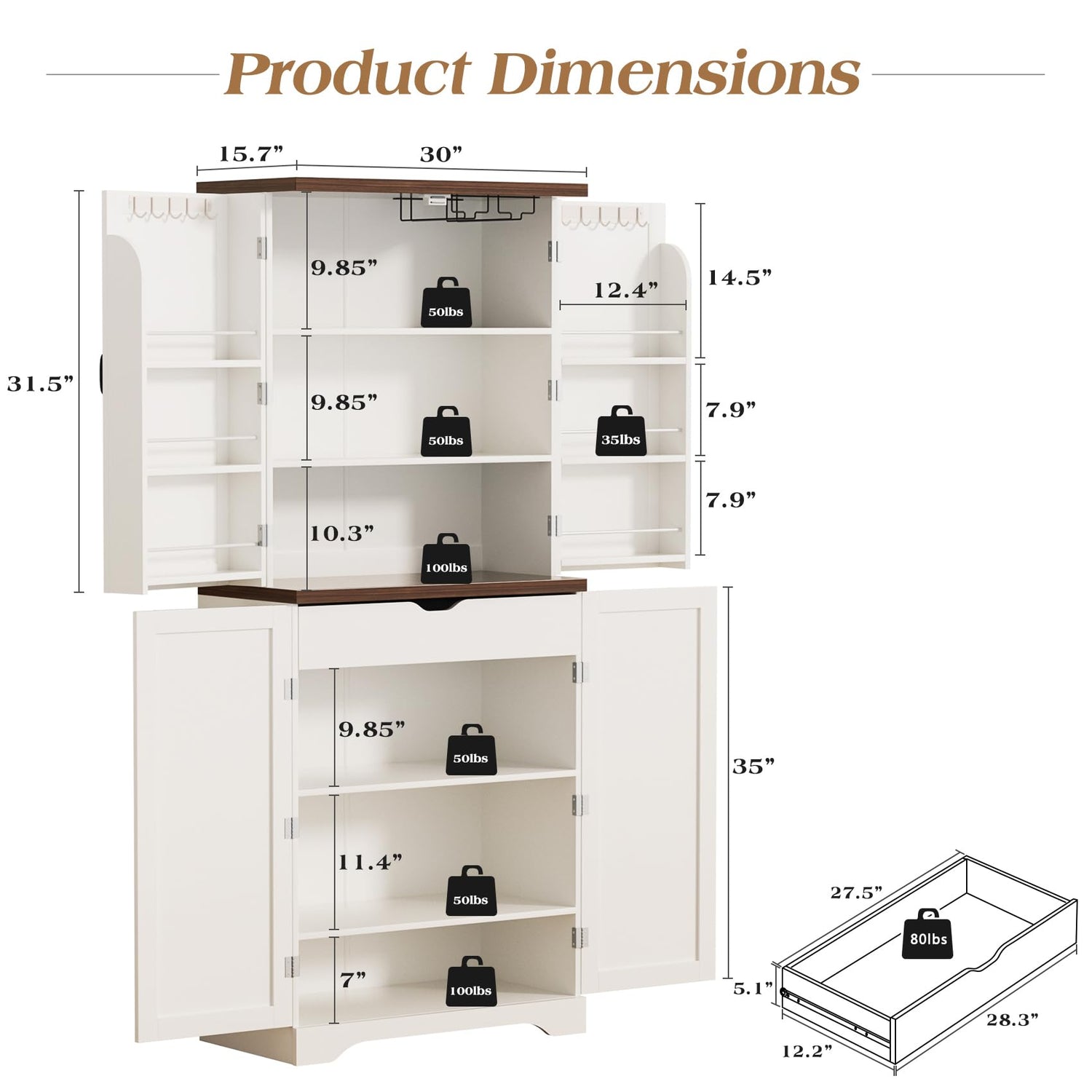 - Spacious Storage Capacity: This kitchen pantry cabinet offers versatile storage with 6 shelves (2 adjustable), 6 door shelves, 2-row wine glass racks, 10 hooks, and a smooth-gliding center drawer. Ideal for keeping your kitchen essentials neatly organized and accessible