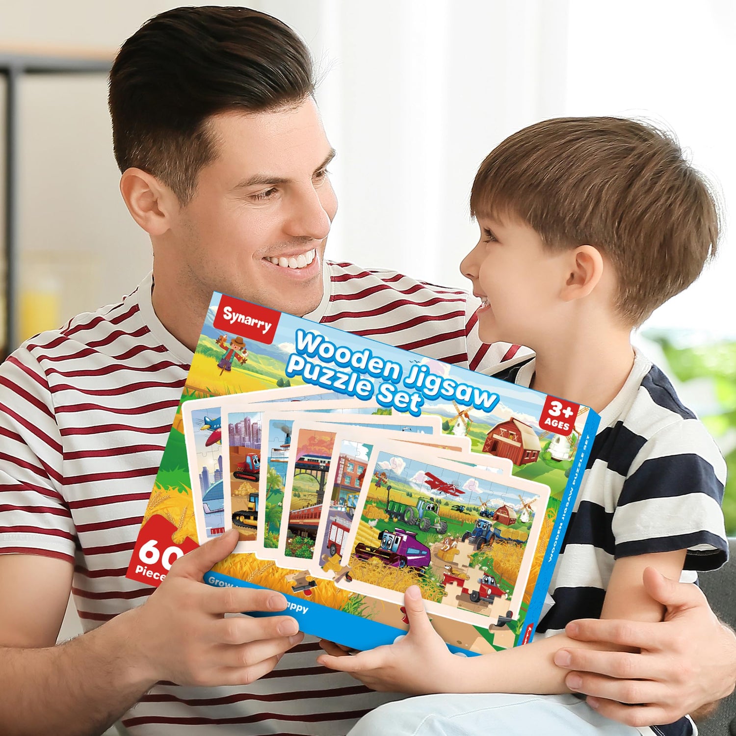 - FUN WOOD PUZZLES FOR KIDS: The Wooden Puzzle set contains 6 packs of 60 durable and bright wooden jigsaw pieces that fit smoothly together when assembled to show 6 appealing themes of transportation, Construction truck-construction site, Emergency Vehicle-street, Farm Vehicle-farm, Train-railway station, Airplane-airport, Boat-sea. All in a colorful box.