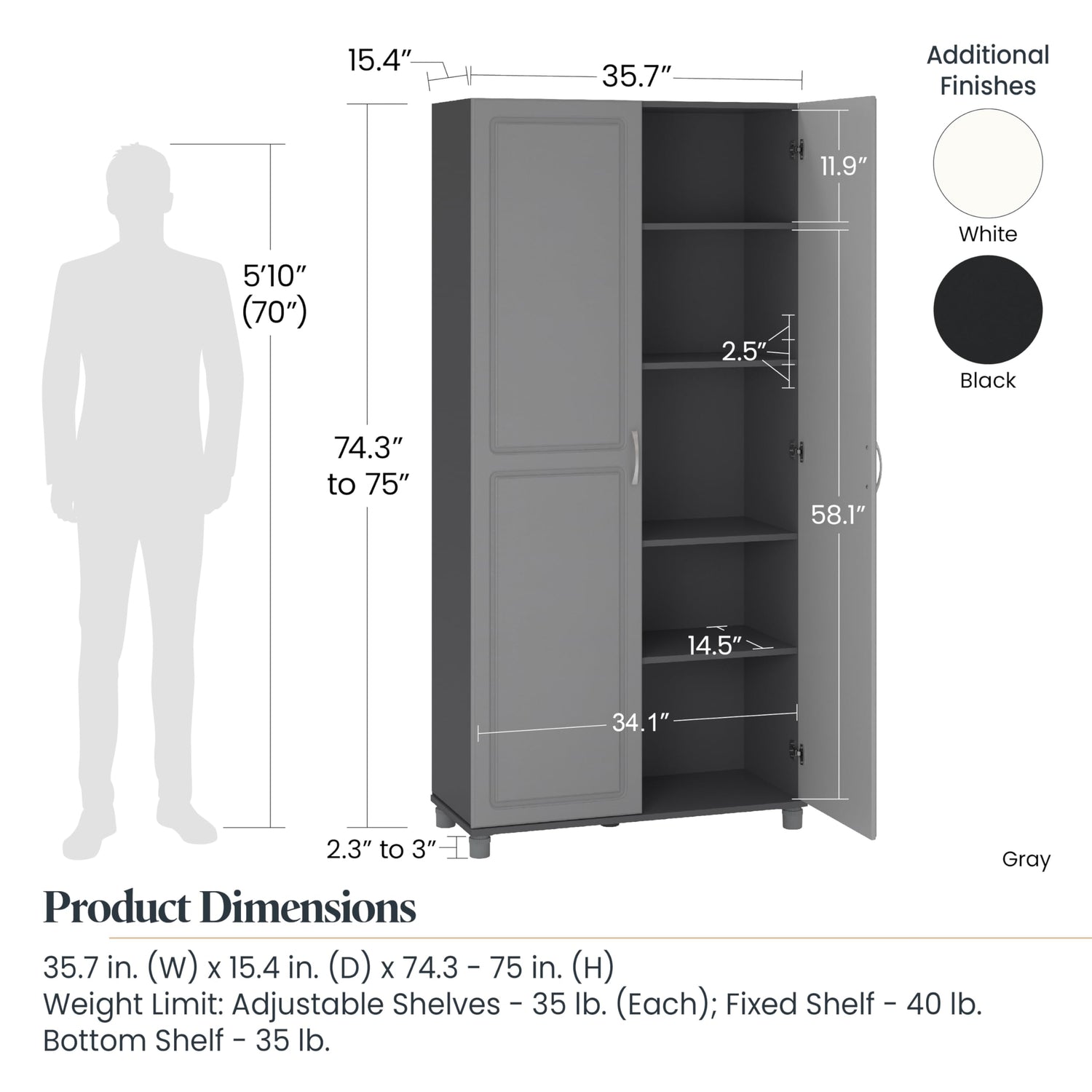 Details: Add extra storage space to any room in your home with the SystemBuild Kendall 36” Storage Cabinet. Made of laminated MDF and particleboard, the water resistant finish is easy to clean so the Cabinet can be used anywhere. The interior of this Cabinet features 5 shelves, 3 adjustable, allowing you to customize your storage for both small and large items. Store and organize anything from office supplies to cleaning supplies and even kitchen pantry items. Soft close hinges are adjustable and prevent slamming doors. The adjustable feet make keeping your Cabinet level on uneven floors simple. A wall anchor kit is included to secure the Cabinet to the wall and prevent tipping injuries. Use this piece as a stand-alone item, or combine it with additional SystemBuild Kendall storage items to create the perfect storage solution for your home. The Storage Cabinet ships flat to your door and 2 adults are recommended to assemble. Once assembled, the Cabinet measures to be 74.3125”H x 35.6875”W x 15.375”D.