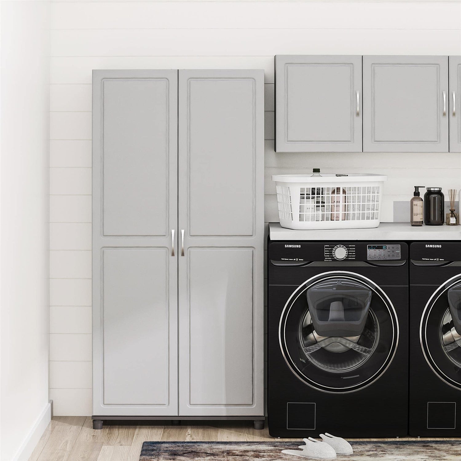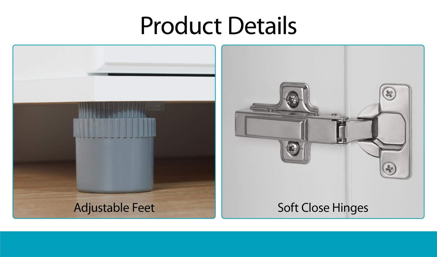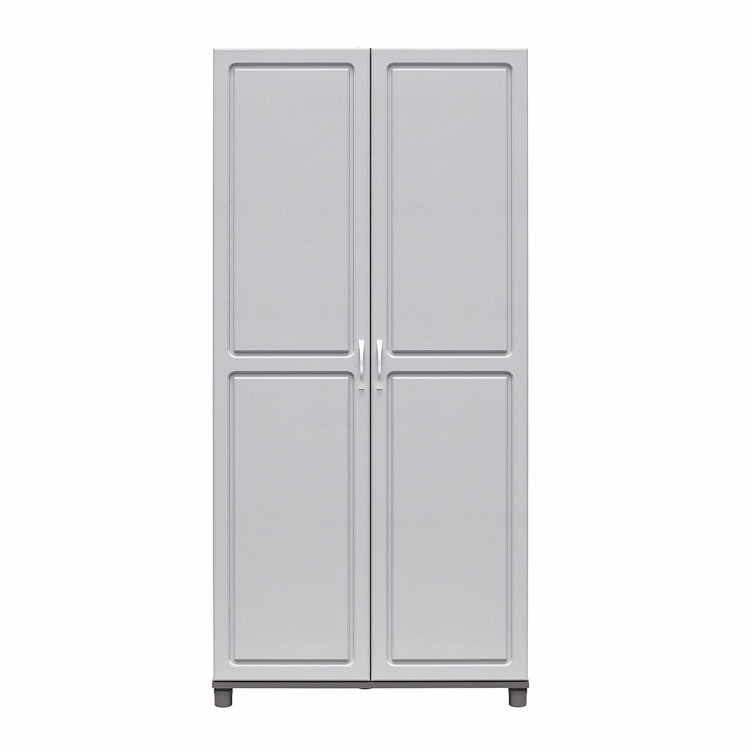 - The 5 shelves, 3 adjustable, can store and organize your cleaning supplies and even kitchen pantry items. Soft closing hinges prevent slamming doors. Adjustable feet keep your Cabinet level on uneven floors