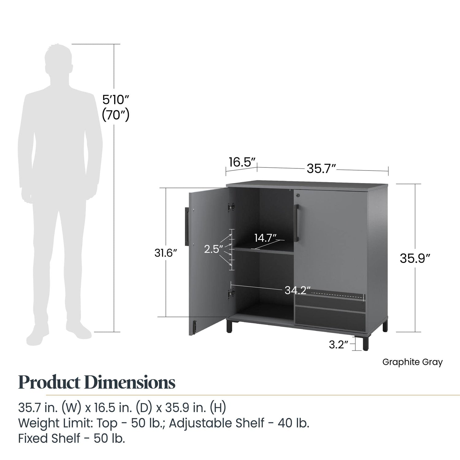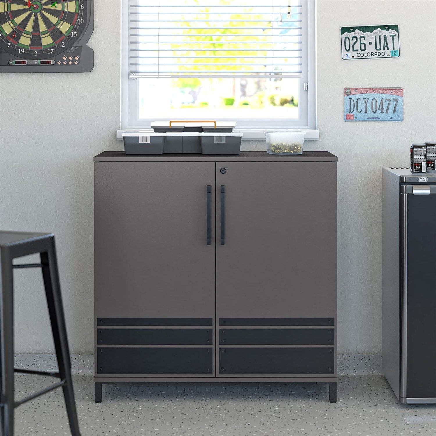 Details: Your garage deserves to look and function at its absolute best. Get organized in style with the Shelby Collection by Systembuild Evolution. Constructed from durable engineered wood with metal plates, handles and feet, the 2 Door Base Cabinet will go a long way in whipping your garage gear into shape. Behind the two cabinet doors is one fixed and one adjustable shelf for storing items tall to small. Safety is key, so keep less kid-friendly items behind lock and key in the convenient cabinets equipped with safety lock. A wall anchor kit is included to prevent tipping injuries. Mix and match storage cabinets from the entire collection. (each sold separately) The Base Cabinet ships flat to your door in one box and requires assembly. Two adults are recommended to assemble. Assembled dimensions: 35.67" W x 16.46" D x 35.98" H.