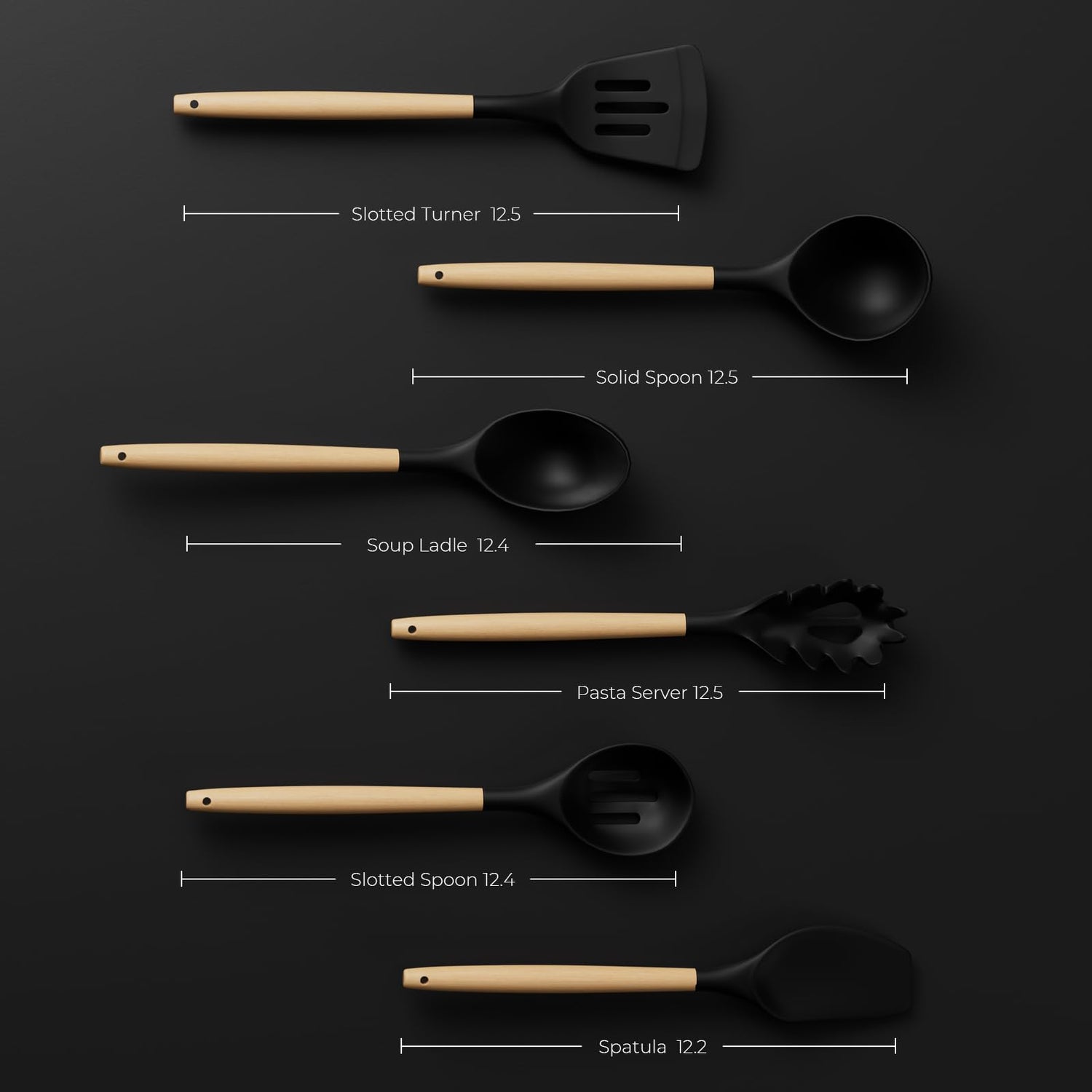 - FOOD GRADE KITCHEN UTENSIL SET: This 6-piece kitchen utensil set is made of food-grade silicone and sturdy acacia wood that is heat-resistant up to 464°F. Sturdy and flexible, it is an ergonomic kitchen utensils with reliable quality, comfortable to use and great value for money